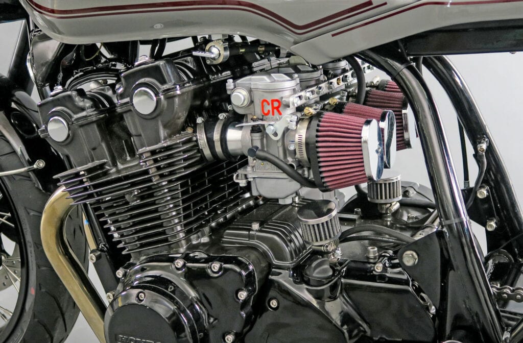 For the engine work, Sylvain focused on reconditioning the 42-year-old inline-four. He resurfaced the heads and replaced valves, rings, seals and gaskets. Then before everything went back together the crankcases were sandblasted and freshened up with a baked coat of crisp black. Not everything was returned to factory spec though. In order to bump up the Honda’s power figures carburetion is now provided by a quartet of Keihin CR29s while the exhaust utilises a custom, free-flowing 4-into-1 system.
