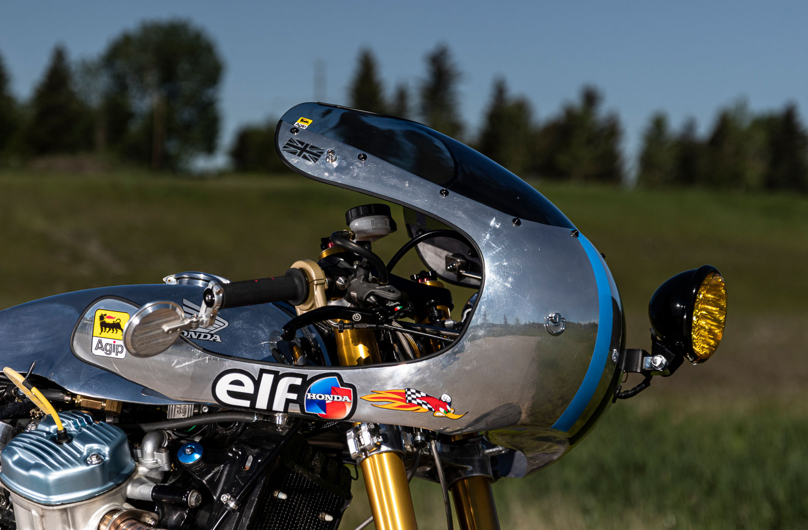 For this project, the Honda’s original bodywork has been replaced by a collection of predominantly aluminium components. Starting at the pointy end there’s an Omega Racer ¾ aluminium fairing. The unit is held in place by polished upper and lower fairing mounts that are welded to the headstock. “The CX frame doesn’t allow for the traditional race fairing attachment and bracing around the headstock,” says Stu. “We had to get creative, but this gave us flexibility on its height positioning.”