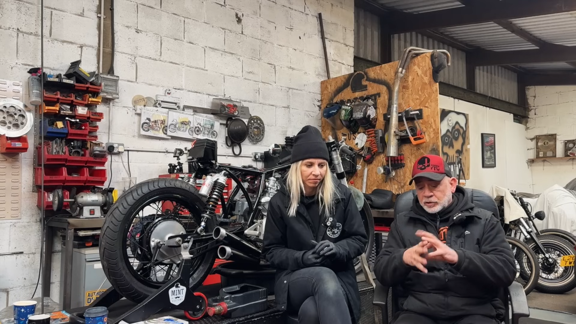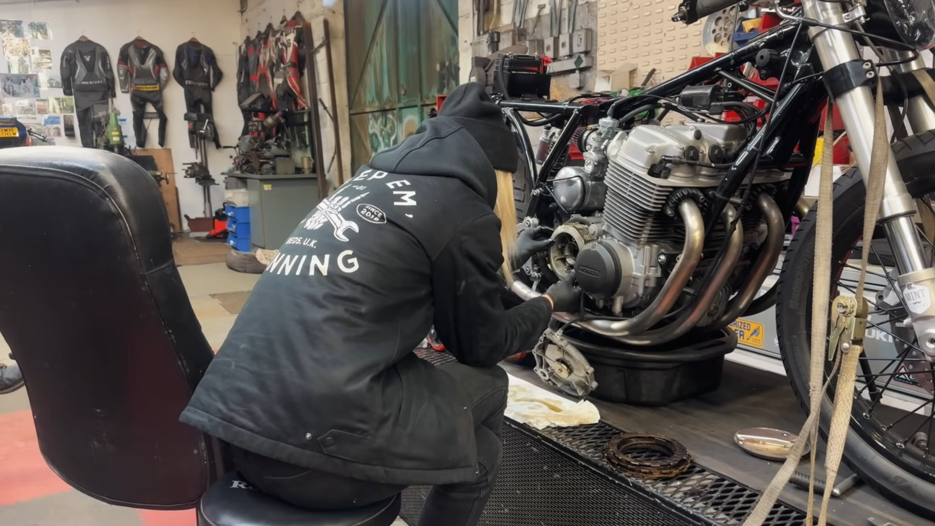 The team focuses on repairing and testing a motorcycle clutch system while addressing a minor fuel tank issue. The work takes place during winter in the UK, so cold conditions influence how long certain parts, like the tank, must dry.