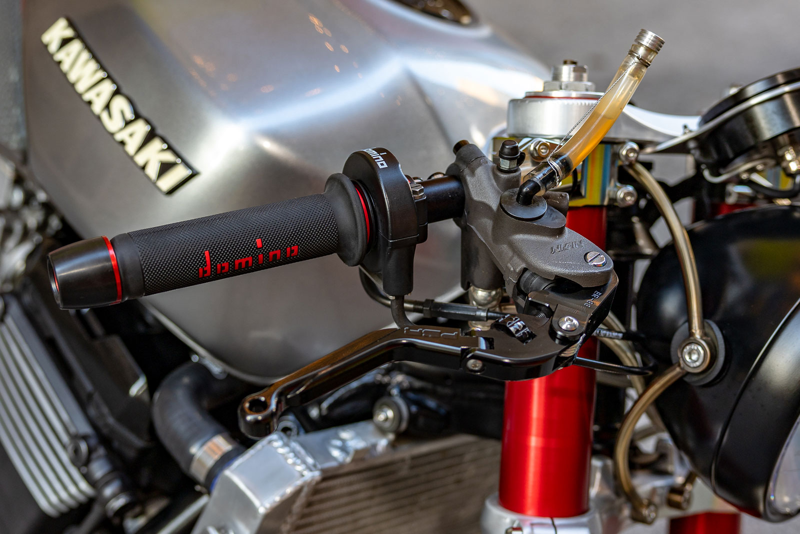 To elevate the bike’s handling, the front end has been swapped out for a setup from a ’94 ZX7R, while new brake and clutch masters were borrowed from a ZX10R paired with stainless steel brake lines and performance rotors. The finishing touch on the controls comes in the form of PSR levers, and a DOMINO throttle. At the rear, the suspension upgrades continue with Ohlins shocks while black Sato Racing rear sets provide style and substance.