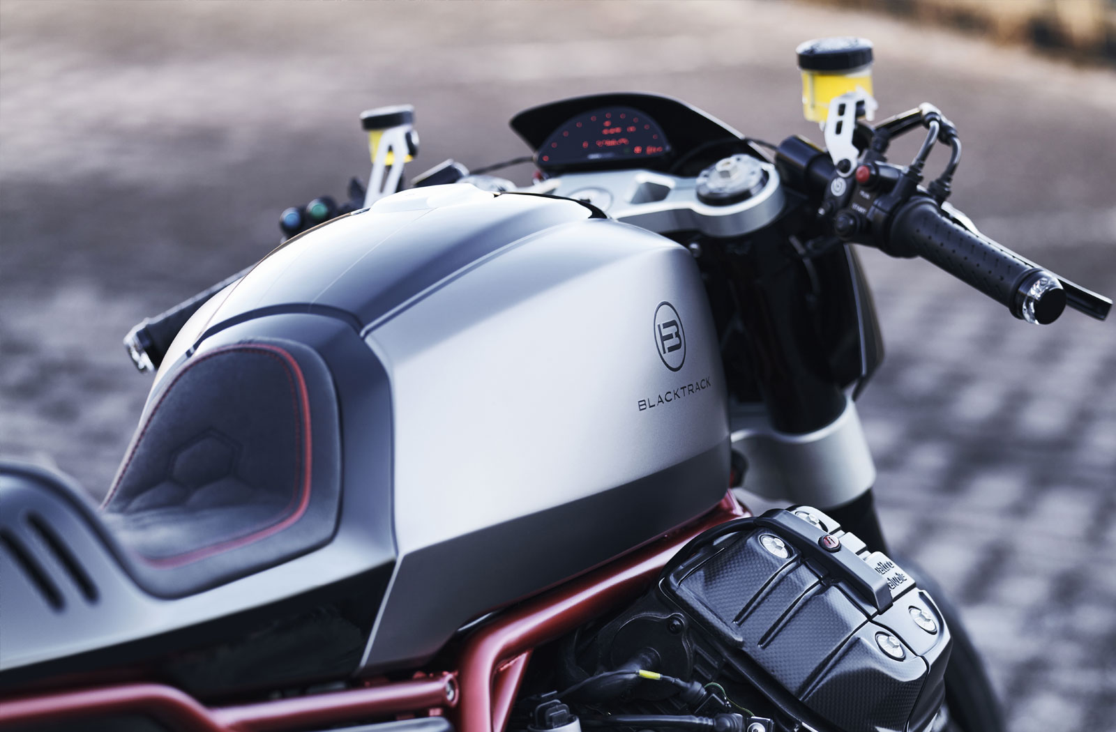 Sacha’s design has been realised by the Blacktrack team in carbon fibre and fibreglass composites. The tightly proportioned tank and tail sit perched over the huge heads of the v-twin to allow both the engine and frame to shine. The styling is minimalistic and purposely angular to emphasise the bikes aggressive attitude.