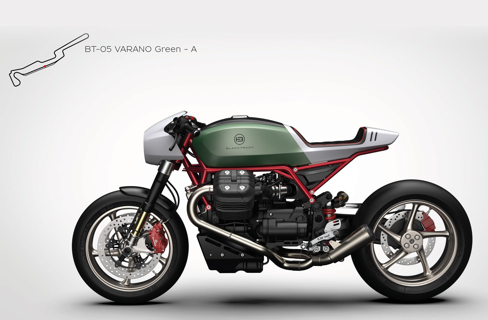 The Blacktrack BT-05 Cento is the first Moto Guzzi based addition to the brand’s stable. Like their other motorcycles, the BT-05 will be produced in very limited numbers for a select few customers to enjoy. In total there will be 10 BT-05 Cento’s built. Each will have a paint scheme and name inspired by famous racetracks like Le Mans Red, Monaco Black and Silverstone Green.