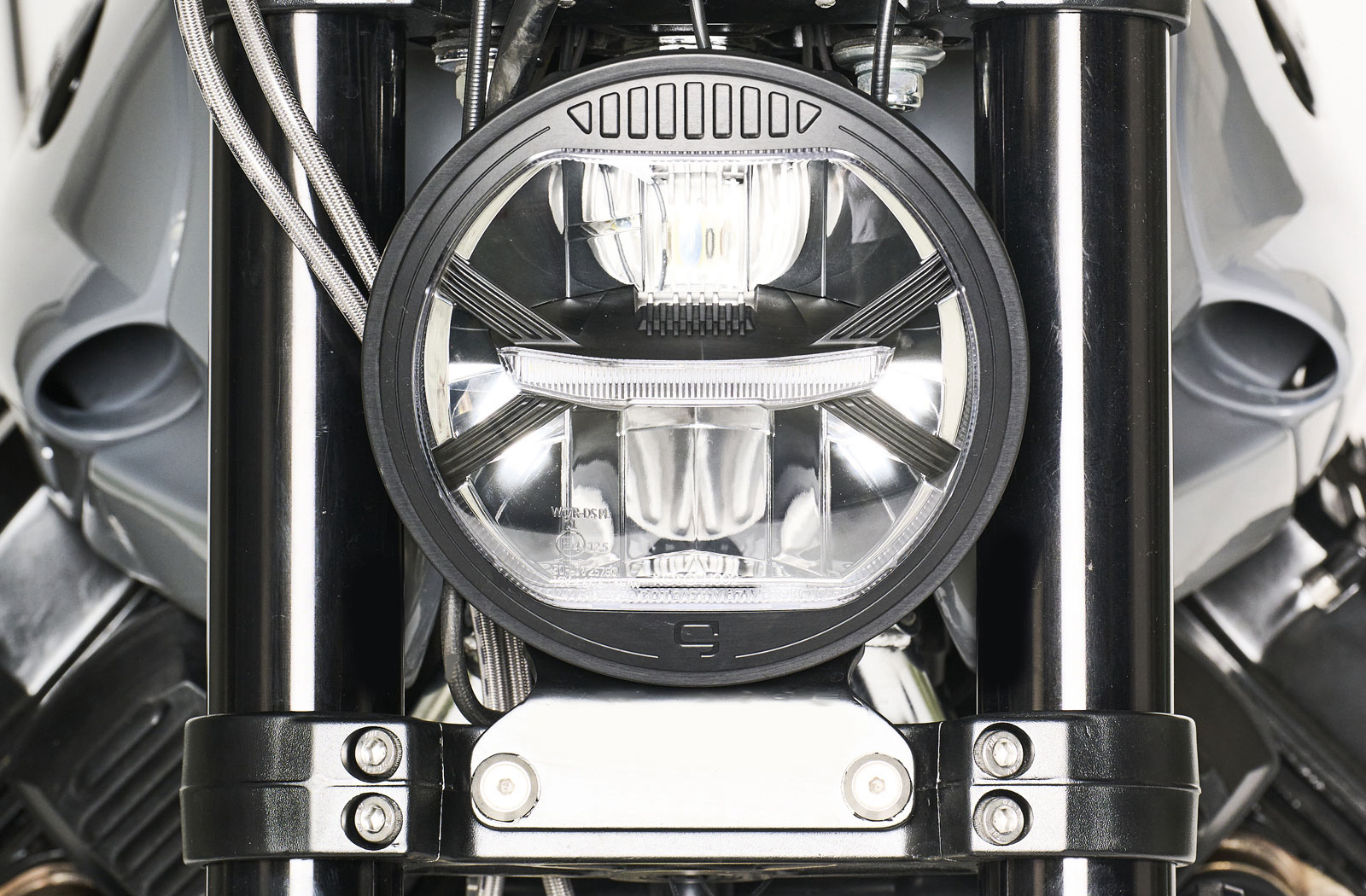 To keep everything looking clean rear-end lighting is provided by dual function ultra bright turn/brake signals and the license plate relocated to a custom-made, side mount bracket. Front-end lighting has also been given an overhaul with tiny LED turn signals mounted to the handlebars and a slim LED headlight nestled between the yokes.