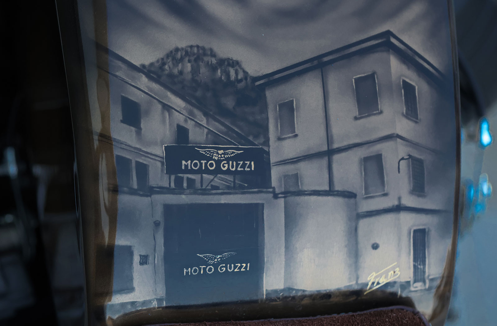 Seeing as this project kicked off in 2021, the year of Moto Guzzi’s Centennial, Stefan decided to theme his project in recognition of the occasion. So once everything had been test fit the bodywork was handed over to his good friend Herbert Franz. Using an airbrush and plenty of gold leaf Franz hand-painted the bodywork. The finished design features portraits of famous racers and engineers from Moto Guzzi’s history books along with an illustration of the company’s famous Mandello del Lario headquarters.