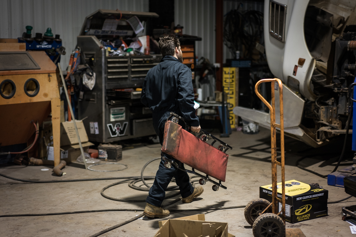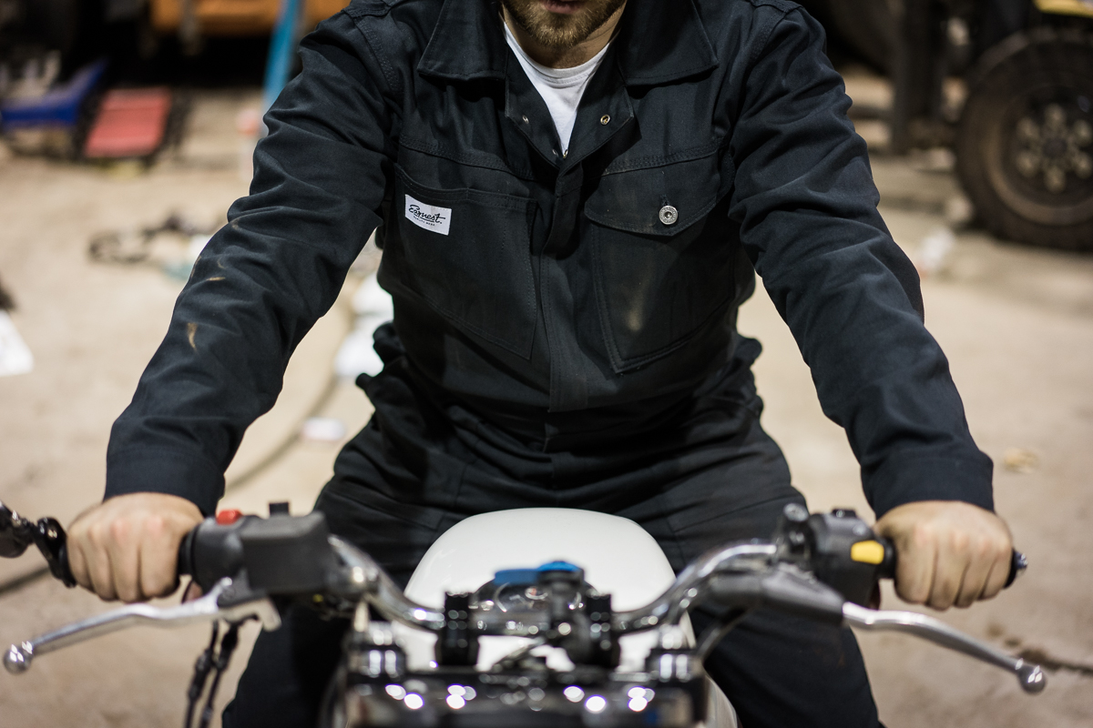 First impressions of the overalls are very positive. All Earnest’s overalls come with a matching duck canvas pouch that you can hang up in your workshop so you have a place to store them. I know most people would just hang them on a hook but regardless, it’s a nice touch. Another thing I noticed was the unique smell which I assume is to do with the dyeing process. The fabric feels strong and sturdy, most likely due to the fine weave of the canvas. All metal fasteners on the garment are either placed up high or are behind flaps of fabric in order to protect any precious paintwork you happen to be leaning across or sitting on whilst working. This one detail proves some very smart and considerate person sat down and really thought about what they were designing – something that is becoming rarer and rarer.