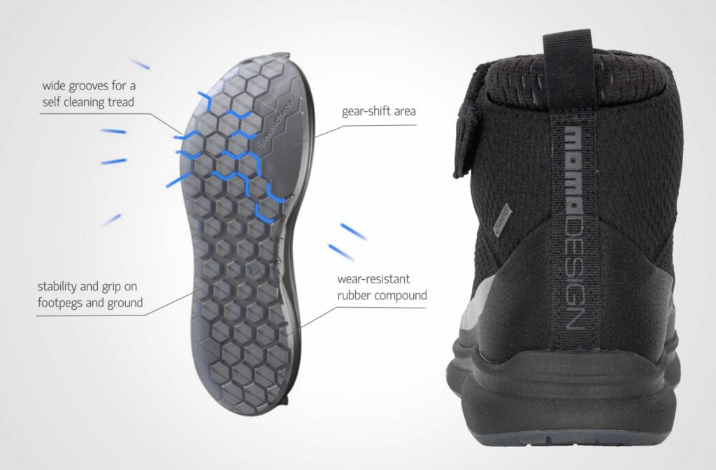 For visual symmetry, both the left and right boots come with TPU shift pads over the big toe. Flipping them over will also reveal dedicated gear shift/footpeg panels designed to offer higher precision and grip while you ride. As for the sole itself, MOMO teamed up with Groundtrax to create a groppy, extremely hard-wearing and self-cleaning sole.