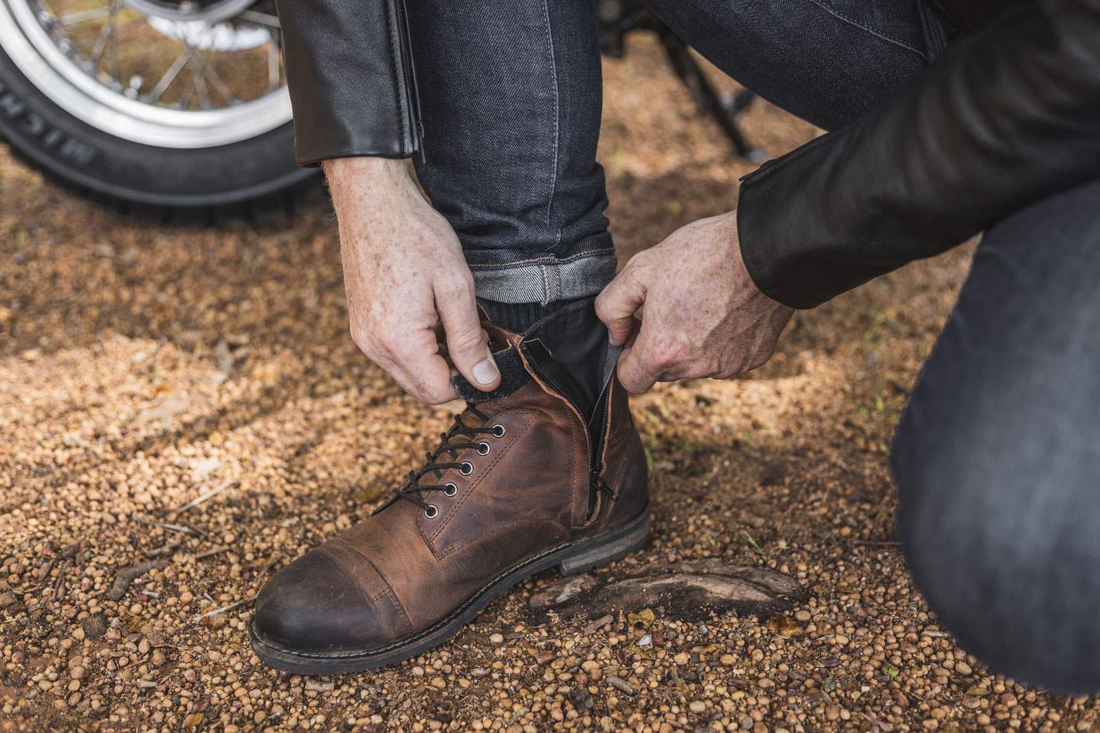 The combination of the laces with speed hooks and side zippers make the Gordon boots quick and easy to get on and off. Once you have the laces done how you like – there’s no need to ever undo them again. I simply unhook the first couple of rows of laces and drop the zipper to slide them off. As for comfort, the boots fit true to size and sit very well on motorcycle footpegs thanks to the heel. You do get some vibration through the sole, but no more than any other boots I’ve owned. As you’d expect from a sole with this pattern, once you put a foot down is exceptional in all conditions.
