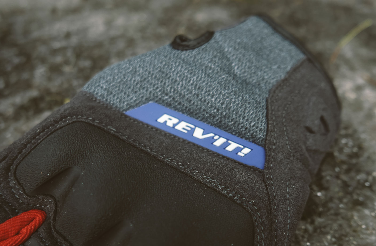 The Rev’it! Volcano gloves are made up of primarily grey tones. But every so often they reveal a splash of bright colour from the bold red air mesh between the fingers. Branding appears as a blue rubber panel with Rev’it! wording and there’s an embossed logo on the side of each hand.