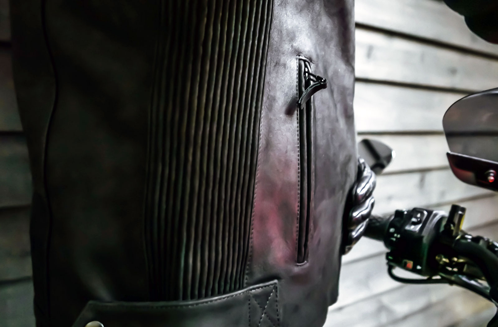 The Pando Moto Tatami jacket is a traditional style motorcycle jacket with a mandarin styled, buttoned collar. Its constructed from black leather and has a handful of retro styling features to add to its classic good looks. It also comes with basic adjustment features to manage comfort levels and body armour for rider safety. Nothing new here. However, out of the box (and the suit jacket bag it’s shipped in), the Tatami jacket is an impressive bit of kit.