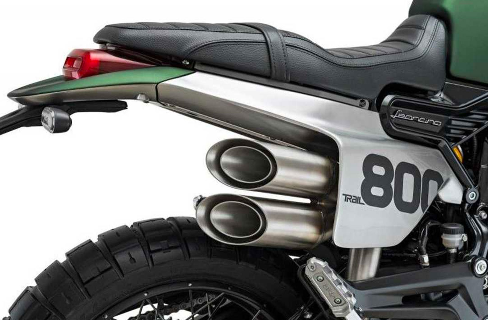 In order to tick off the customary Scrambler cliches, Benelli has fitted the Leovinco Trail 800 with a set of high mounted exhaust pipes, faux racing number plates and a decorative headlight cowl. On the more purposeful side of things the Leovinco Trail 800 is running a set of 19-inch rims wrapped in knobby rubber and tall Marzocchi suspension front and rear.
