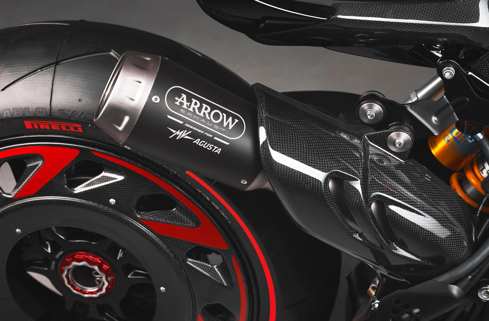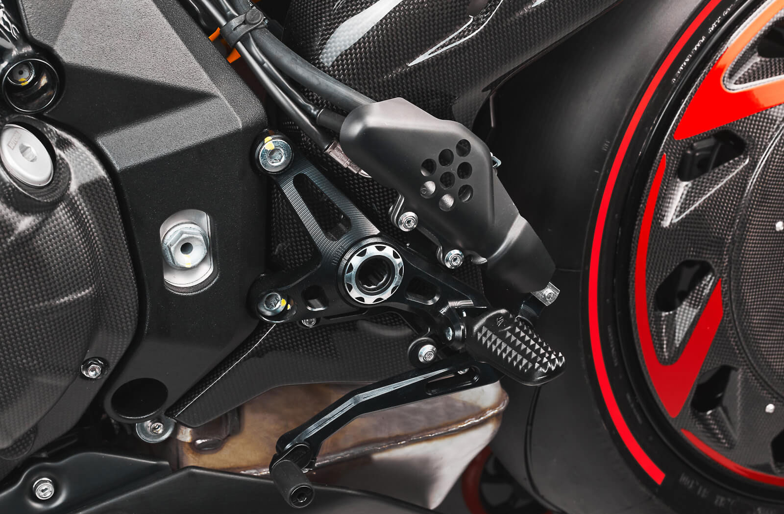 The use of carbon fiber throughout the body of the Rush gives it a high-end appearance but also helps keep the bike light and nimble. Many of the body panels, including the unique cover on the rear wheel, and engine covers have been forged from carbon. MV has also made use of titanium and aluminum for many of the brackets and fixings resulting in a dry weight of merely 186kg.