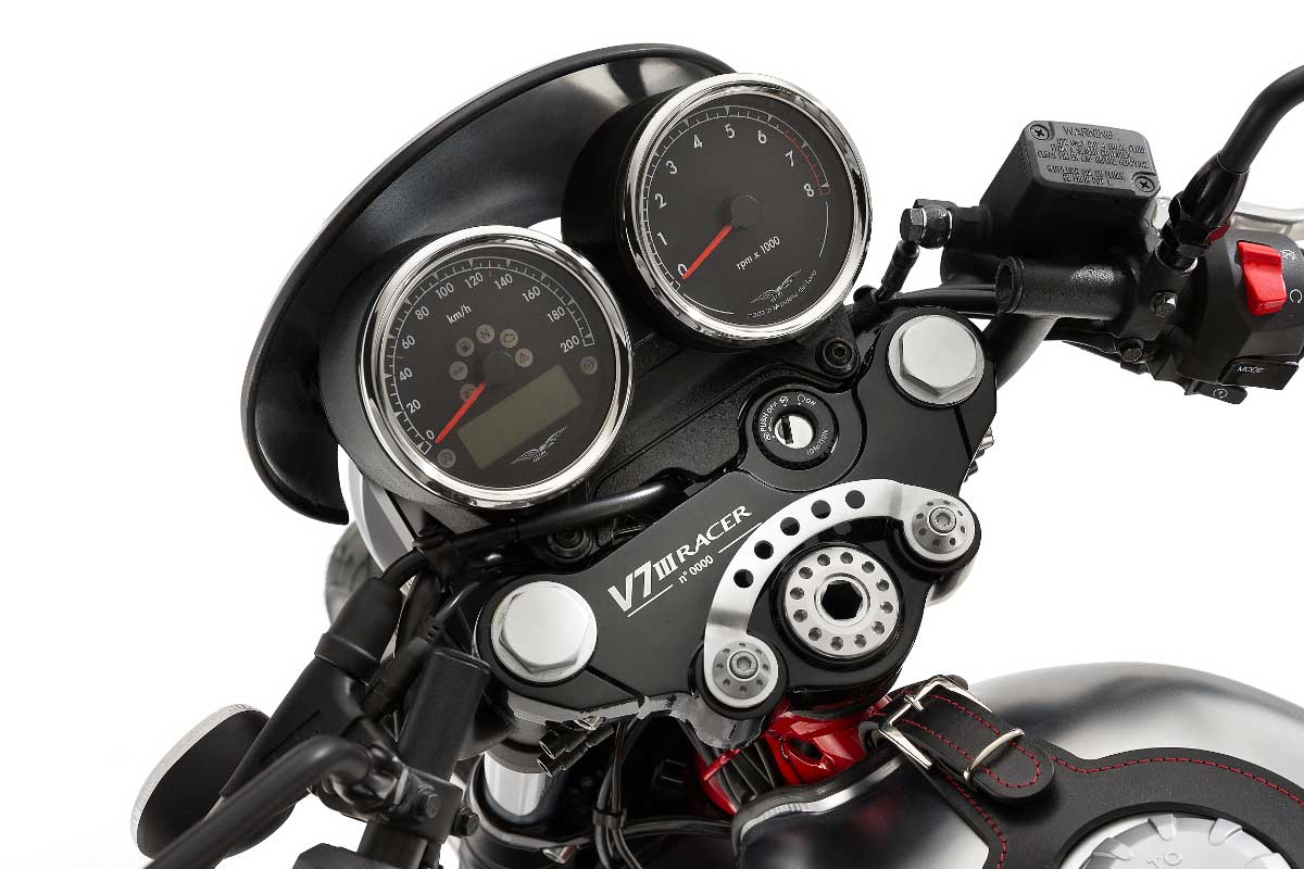 I awarded the Moto Guzzi top marks for styling and components. The bike’s machined rear-set footpegs look convincingly like aftermarket items and the huge mufflers are straight out of the 1950s. A leather strap across the tank, the tank itself and the fact that they’ve kept branding to a minimum add to the V7 Racer’s authentic look. The V7 series has a great back story that spans 50 years so this model also has a genuine reason for existing. The only thing letting the Italian down was that it didn’t offer any extra grunt over a standard V7.