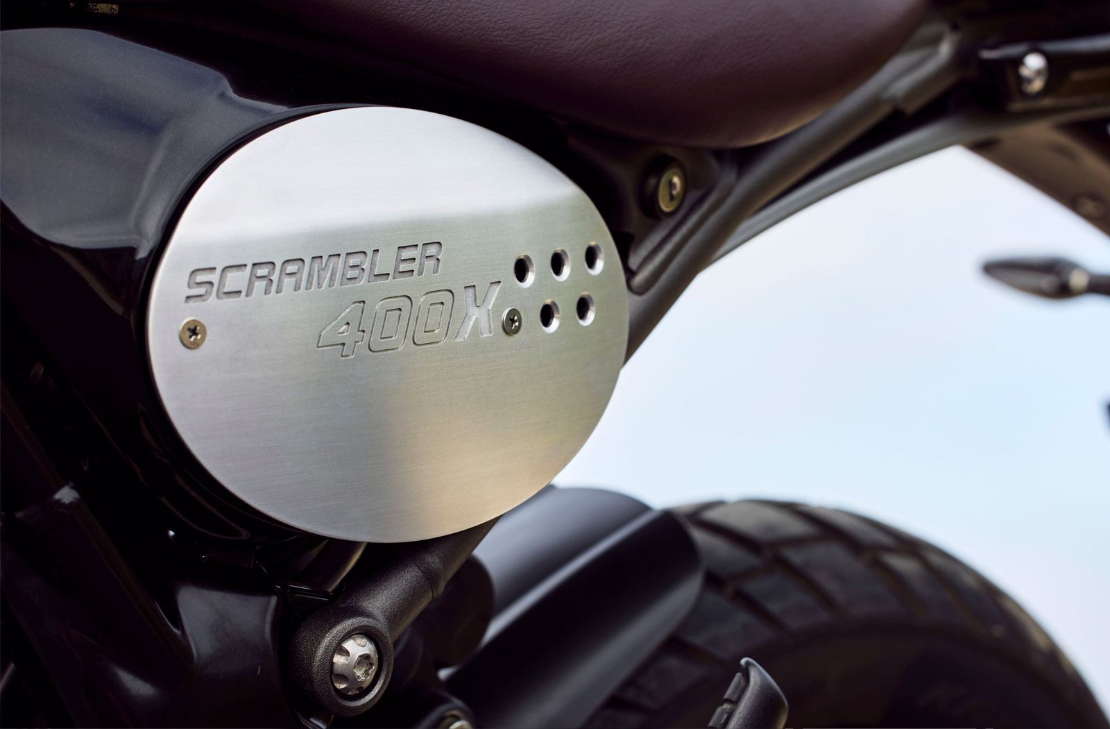 Aside from some slight variations in geometry, wheel size (19 F/17 R) and switchable ABS for off-road riding, the biggest differences between the Scrambler 400 X and the Speed 400 are in its equipment. At the pointy end, the Scrambler 400 X gets different handlebars with twin yoke clamps and a bolt-on brace. The headlight sits behind a laser-cut alloy stone guard and there are brush guards covering each grip. The footpegs are wide and the levers cast steel with a bear trap-style grip. Both the sump and radiator are protected by guards. And the seat is a 2 piece design which allows the removal of the rear section to fit a luggage rack.