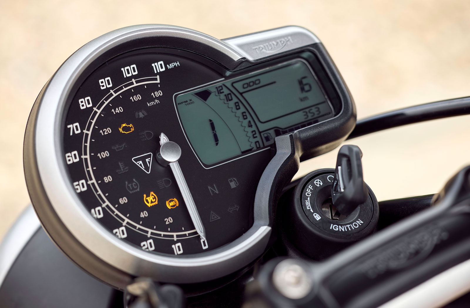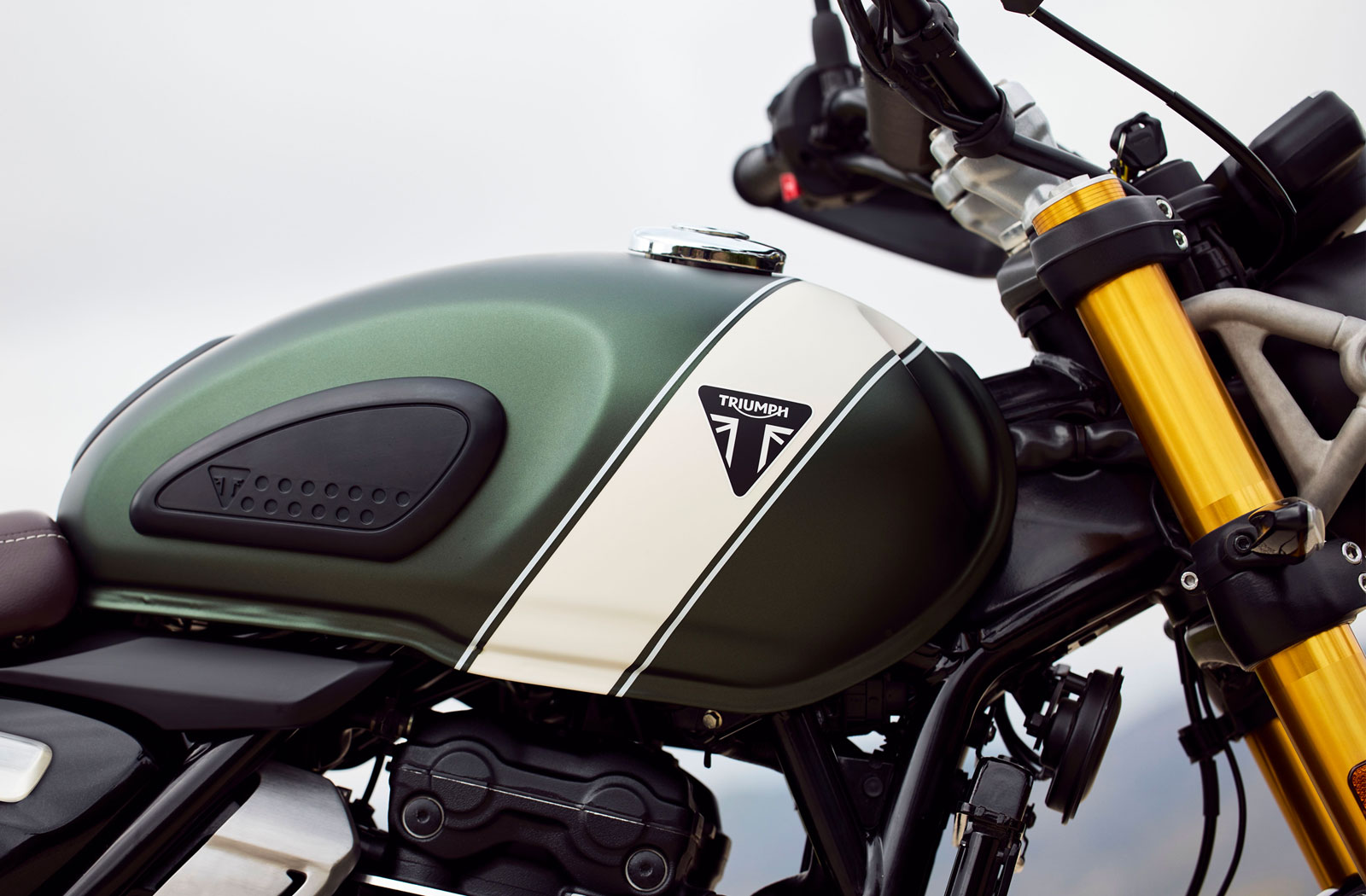 Both of the new Triumph 400 models feature the latest safety technology in the form of ABS and switchable traction control. Fueling is managed by Bosch electronic injection and the throttle is ride-by-wire. The suspension comes in the form of gold ‘big piston’ 43mm upside-down forks and an RSU gas monoshock with pre-load adjustment although the Scrambler offers 20mm of additional wheel travel. The classically styled fuel tank holds 13 litres and both models offer fuel consumption of around 63mpg. The cockpit consists of a single analogue speedo with an integrated LCD that displays current gear, revs, remaining fuel and trip information.