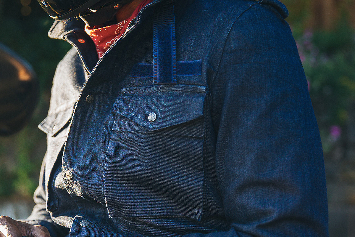 The material that the M65 is constructed from is what really separates this jacket from traditional denim. It’s denim for sure, but nothing like I’ve experienced before. It’s not like the raw denim that’s made in a mill on some small island where they take their craft to levels of pure obsession. It looks similar, but is actually a clever blend of denim, Cordura, and CoolMax fibres. At 12.5 oz. thick it’s about the same density as a middleweight denim jacket, but the interwoven Cordura adds significant abrasion resistance. Not only that, the M65 has summer heat beating ventilation vents which did their job well during my tests because someone definitely forgot to turn on the A/C and I was still feeling somewhat fresh.
