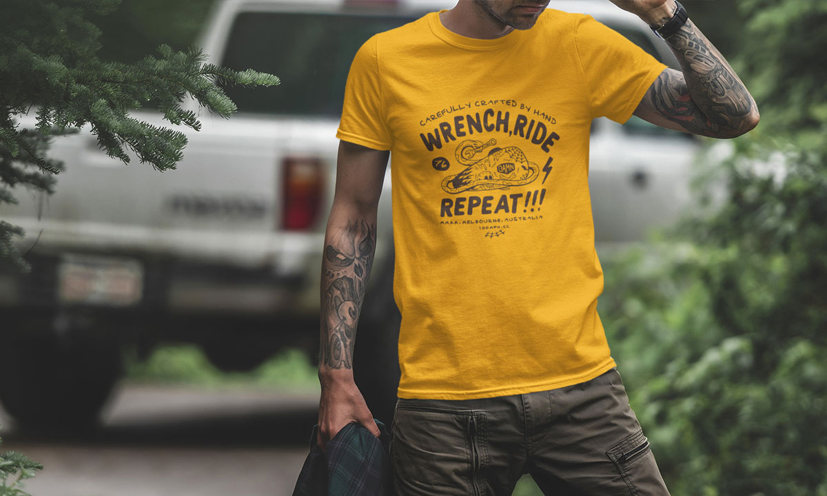 Wrench, Ride, Repeat is available on either a yellow gold or dark heather grey base. The t-shirts are produced by US manufacturer Bella + Canvas and feature shoulder to shoulder taping, side seams and are preshrunk to ensure they fit true to size wash after wash. Available in sizes S through to 3XL you can order yours here.