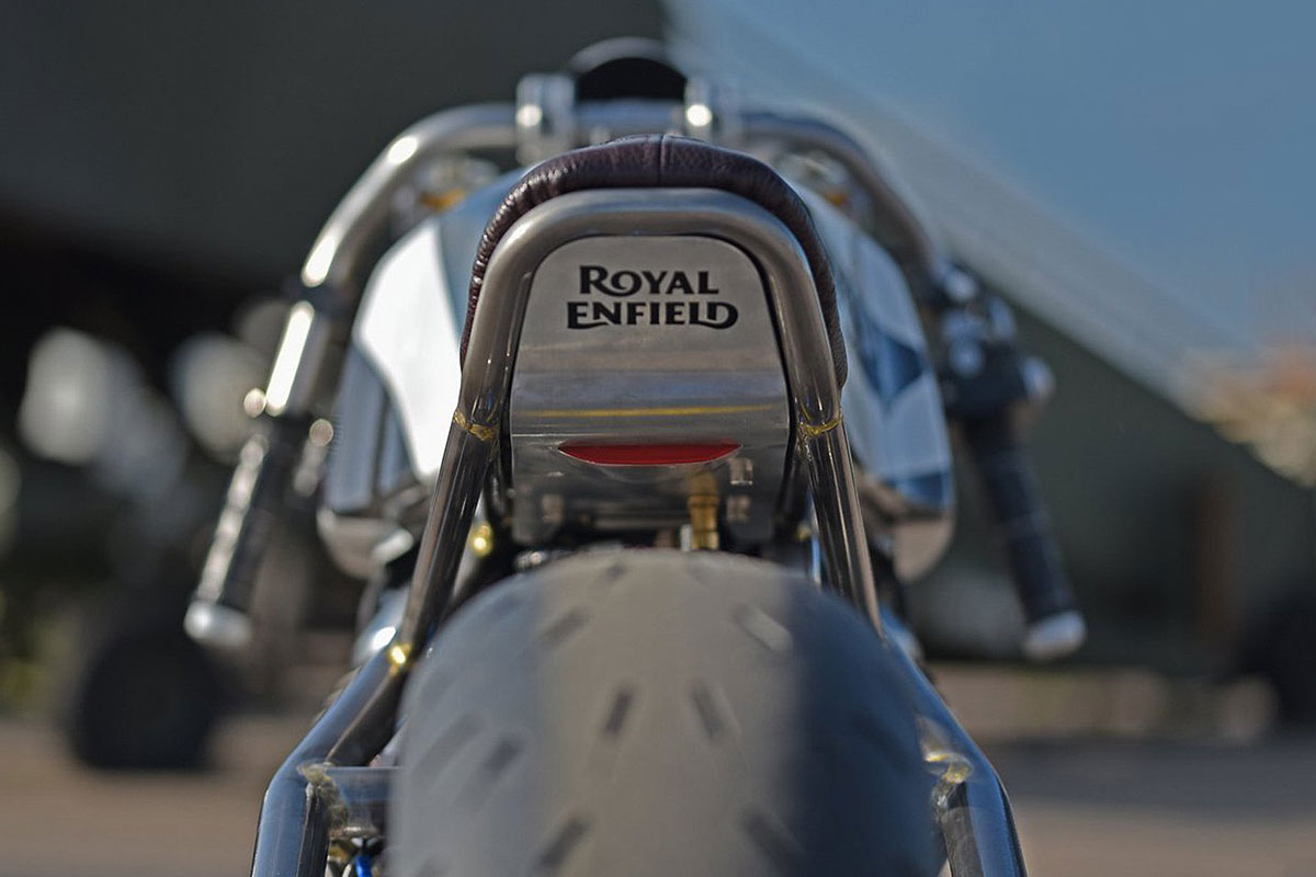 Once the engine was dialed in Royal Enfield enlisted the help of frame experts Harris performance. To suit the bikes drag racing destiny Harris developed a hard tailed mild steel frame constructed using traditional race-style bronze brazing. Mated to the neck of the frame is a modified set of Öhlins forks and the whole setup rolls on PVM forged wheels. Brembo HPK and Goldline brakes take care of the less important decrease in speed while Shinko Hook Up tyres keep the bike firmly planted.