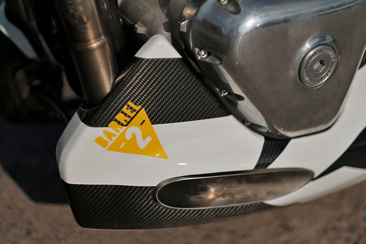 Keeping weight to a minimum is essential on any race focused machine which is why all of Lock Stocks bodywork is made from carbon composites. Beneath the tank cover is a sturdy fuel cell that holds barely enough to complete a couple of runs and the dash is devoid of dials. As for the unorthodox zebra styled paint, it’s a nod to the camouflage used to disguise manufacturers test vehicles. The riding position is equally unique, designed to allow the rider to tuck in low and focus on nothing more than maintaining a straight trajectory.