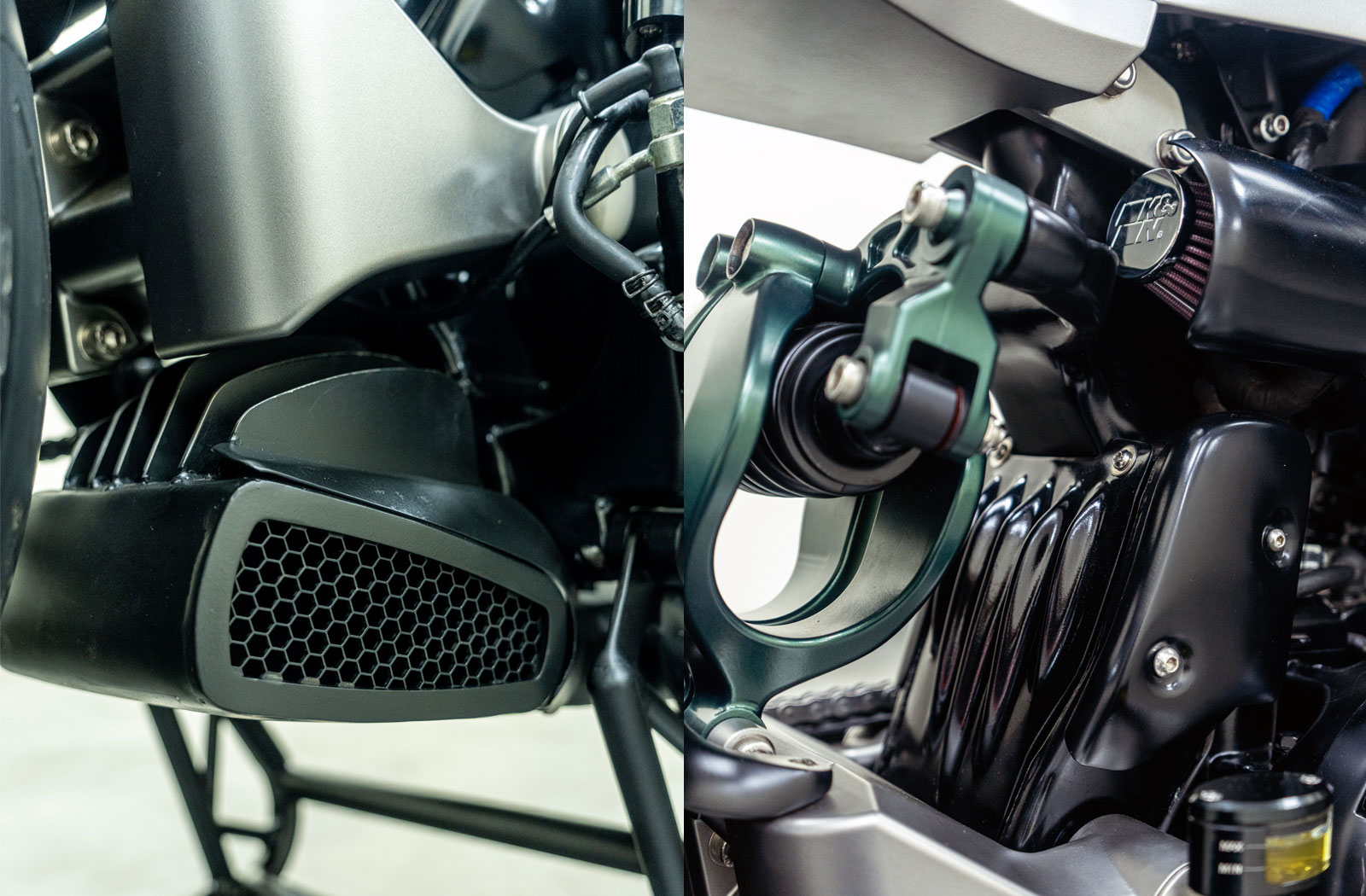 A custom aluminum bash plate was made for the front of the engine, which will probably help keep the engine free from debris flicked up by that enormous front wheel. The combination of raw aluminum, teal-green matte, and black paint splashed across the bike is both flashy and understated. Suffice it to say, we love the final result.