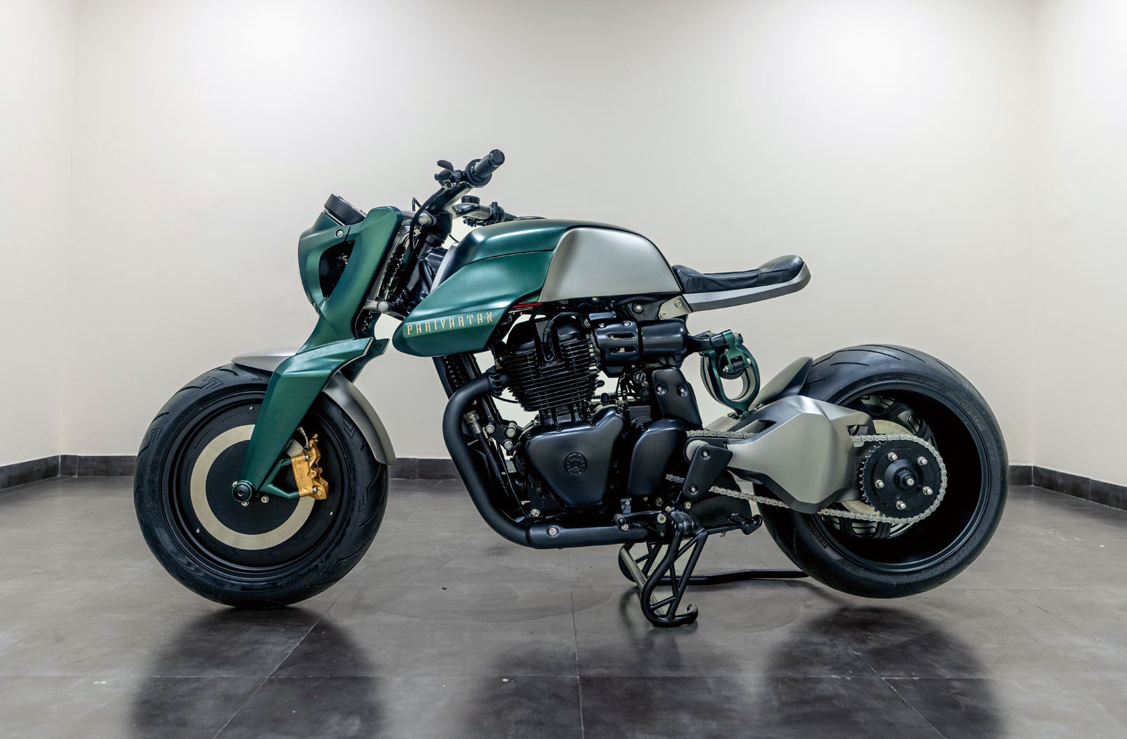 This stunning creation results from over 500 hours of meticulous design, 3D modeling, and fabrication work by Naveen Nandal and his team at TNT Motorcycles. Based on a new Royal Enfield Shotgun 650 and built for Royal Enfield itself, Naveen has named their new build “Parivartan”, which translates to English as “transformation” – and what a transformation it is.