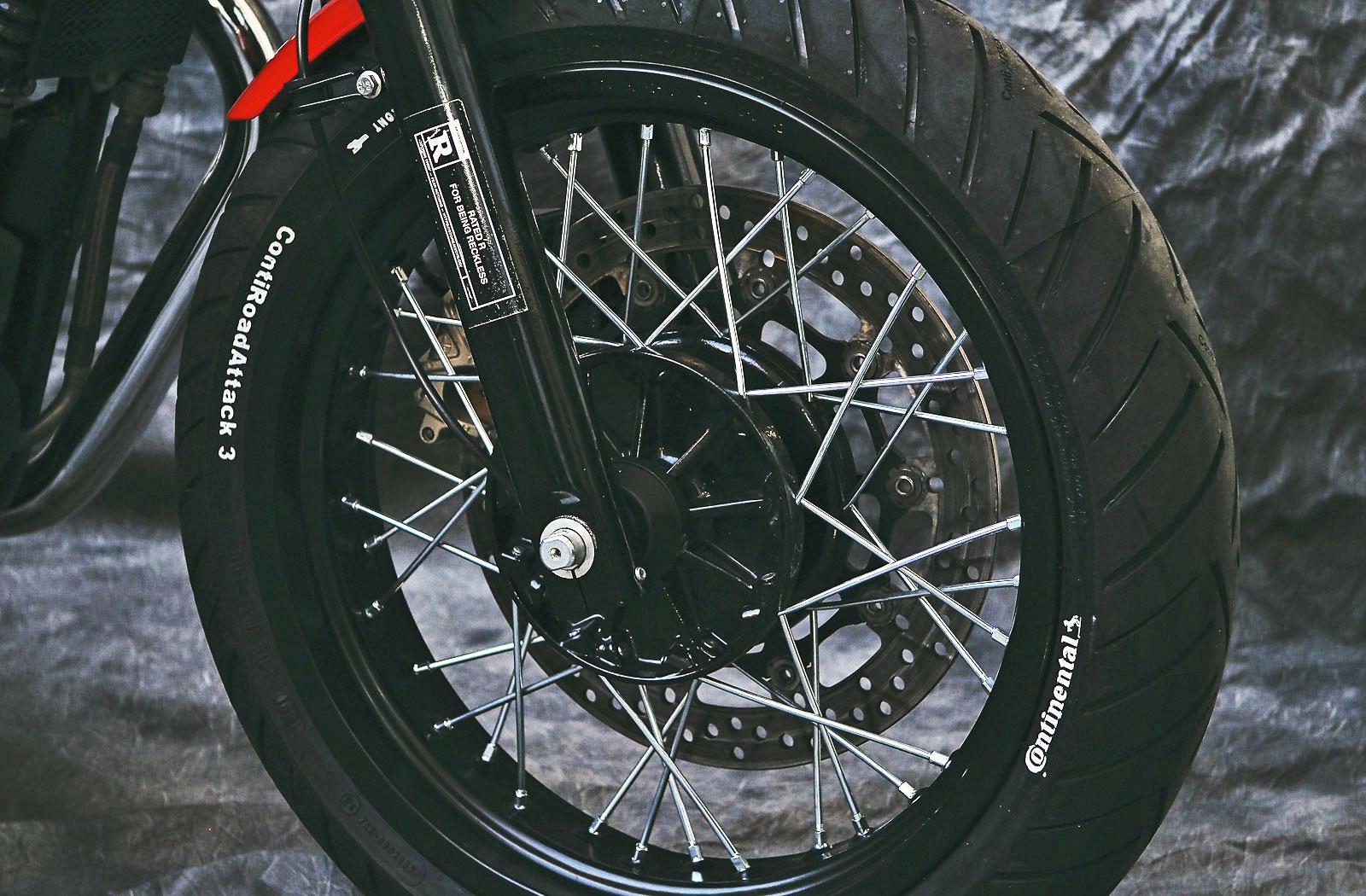 To unlock more power from Royal Enfields 648cc parallel-twin there’s a shortened twin exhaust sporting Turbokit mufflers and a free-flowing DNA air filter.