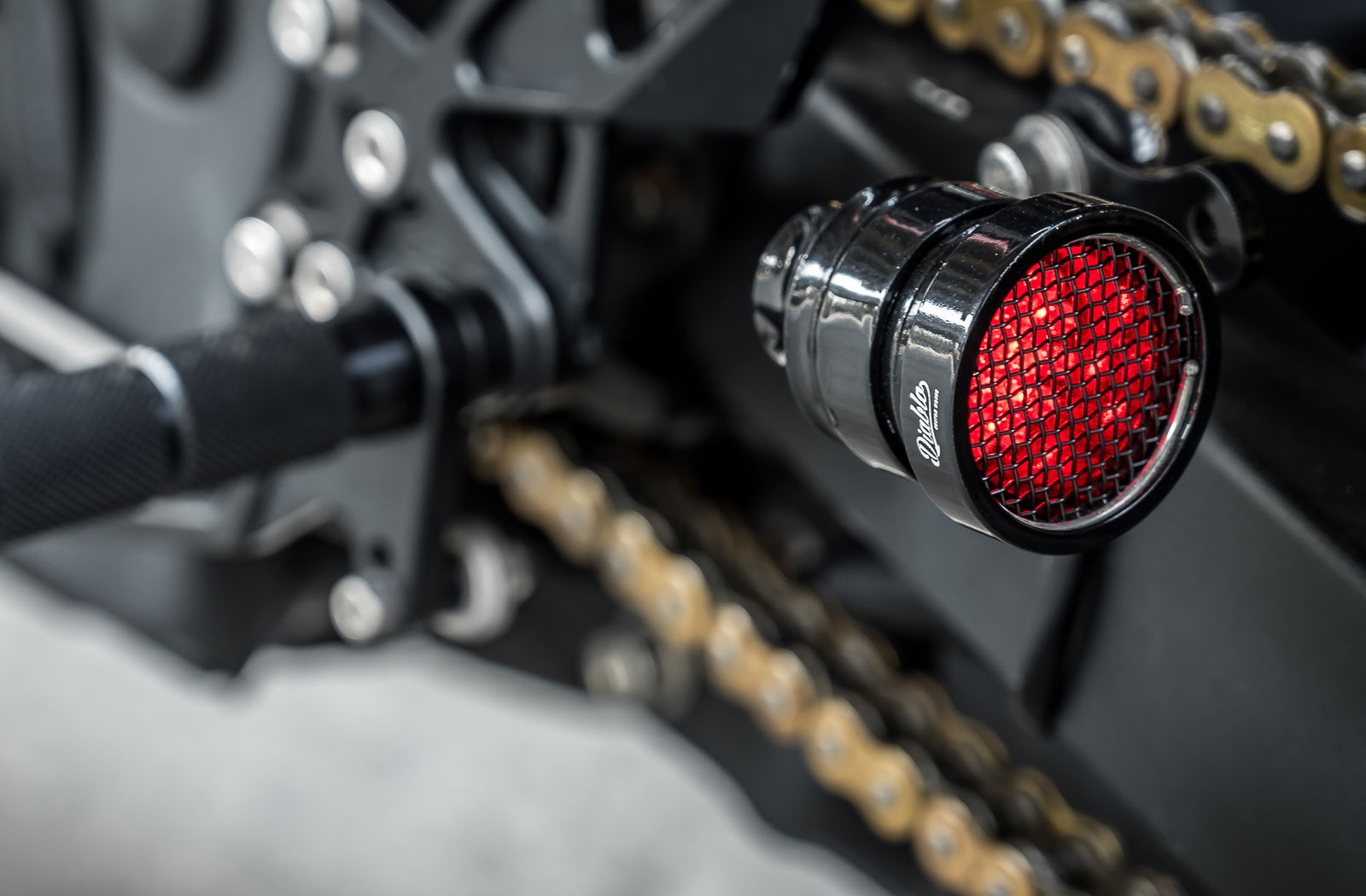 Other components you’ll find from the Diablo parts catalogue include rear-set footpegs, braided brake lines and a side-mounted LED ‘shot glass’ brake light. Well hidden LED turn signals keep things street legal and the original gauge cluster has been traded for a tiny digital alternative.