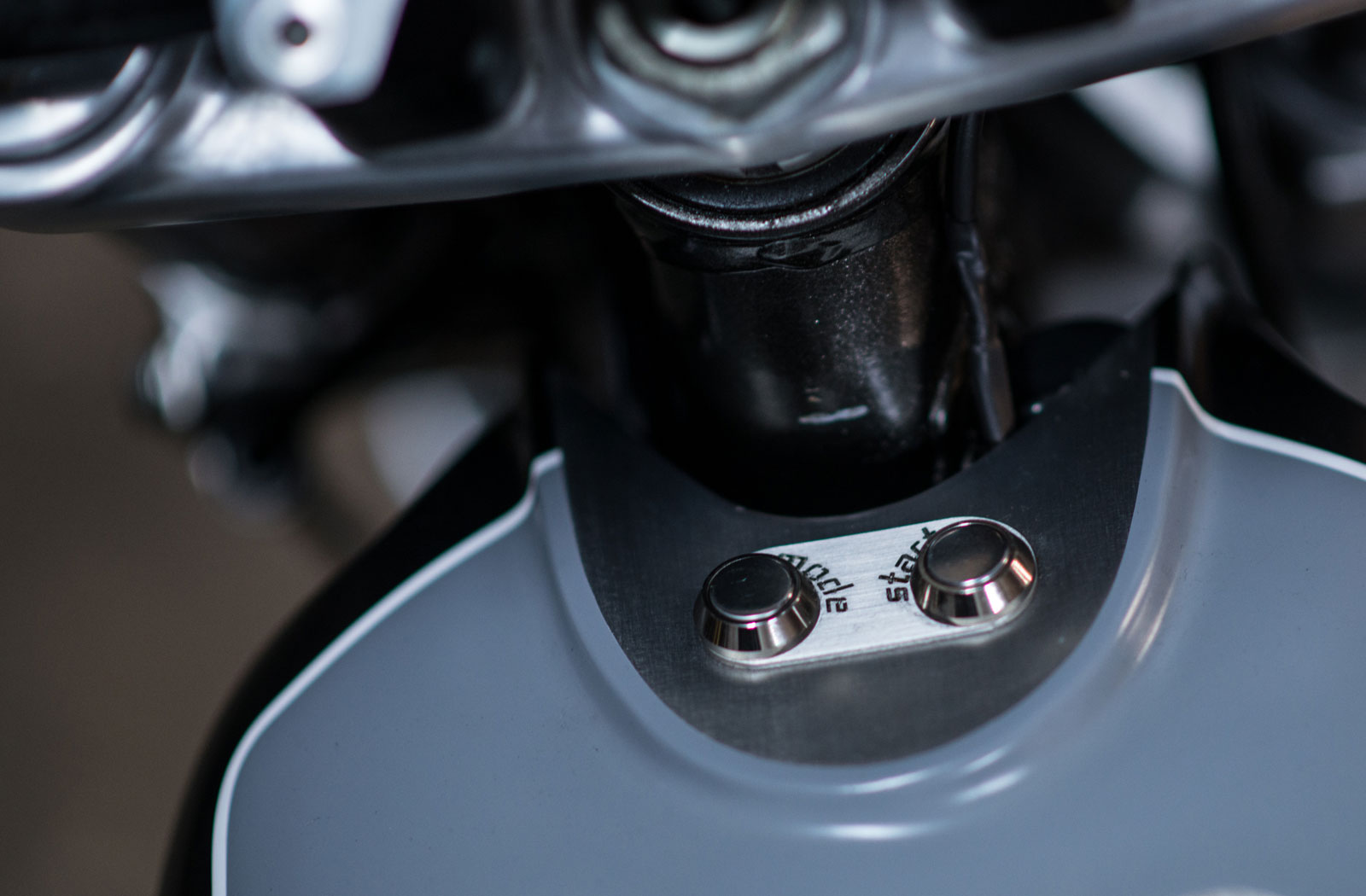 The stock wheels were replaced with a set of 17” Excels and painted gunmetal grey with black spokes and a brushed lip. I decided on Shinko white walls as I thought were a great fit for the bike. 130 on the front and 160 at the rear. The stock hand controls are replaced with tiny stainless steel push buttons on the handlebars and fuel tank and the wiring runs internally, again to keep things minimal.