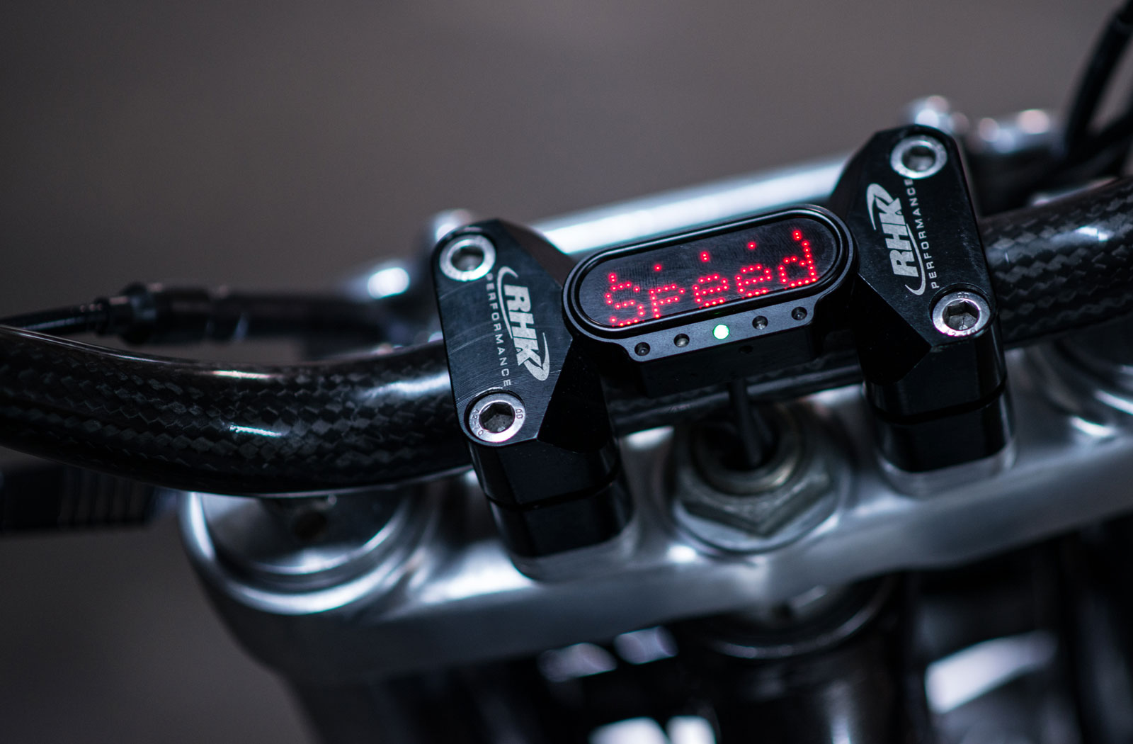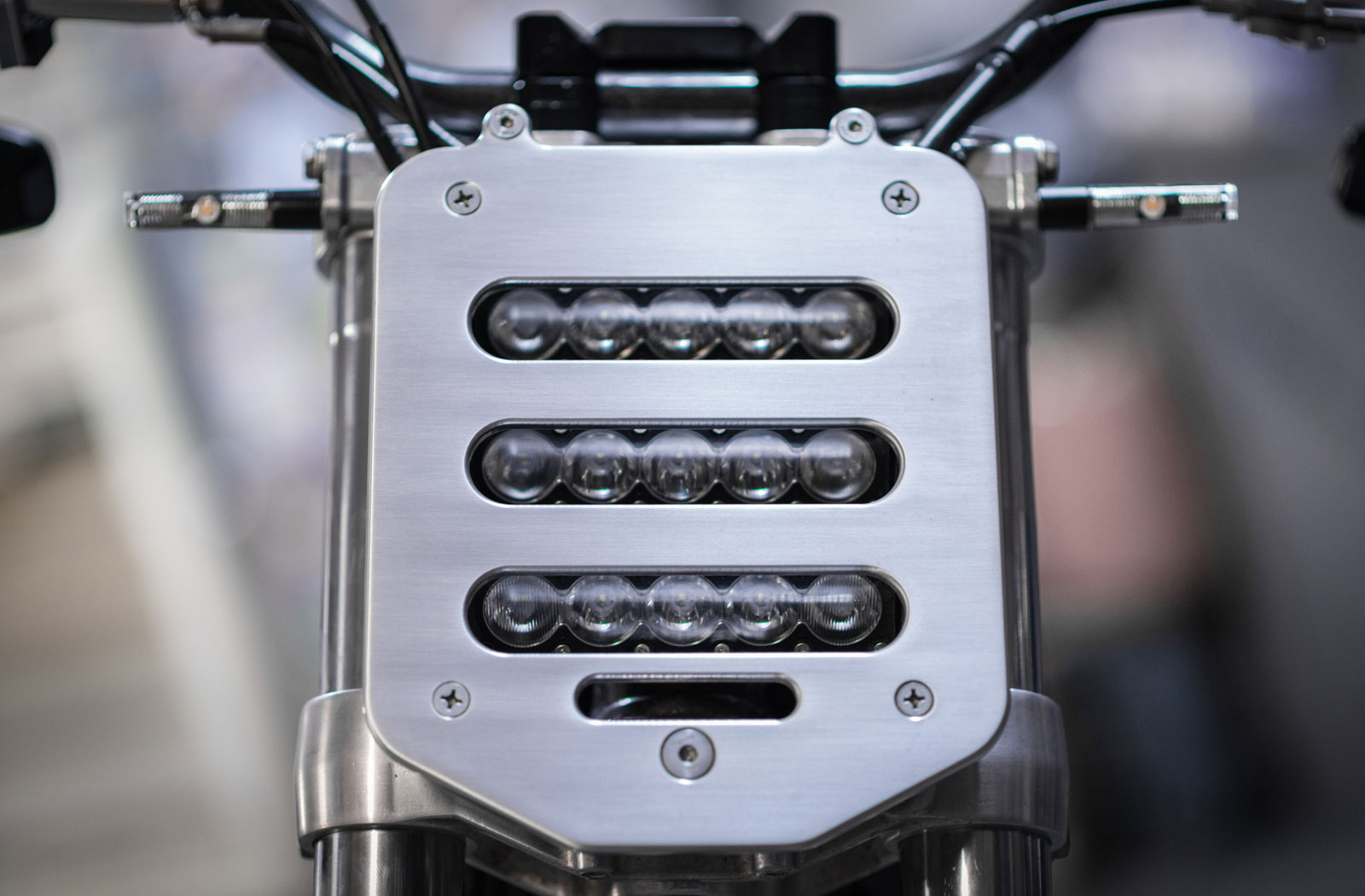 The carbon fender was also created by Scott and carbon wrapped set of fat bars were added. To match the lighting at the rear I positioned a couple of LED turn signals in front of the handlebars. The number board/faceplate was laser cut and machined the same way I did the subframe, and to keep everything as compact as possible 3 LED headlight strips were installed into it.