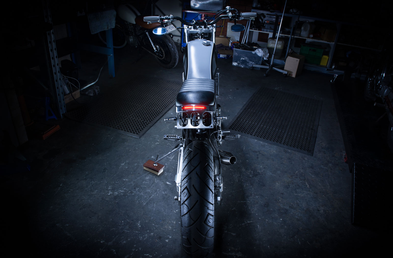 The stainless steel exhaust I made needed to be simple and the Lossa Engineering muffler was the perfect addition to finish it off. Aftermarket parts like the brake/clutch levers and the expansion reservoir were chosen as they matched the machined alloy look of the bike. A Motogadget Miniscope speedo was installed between the bar clamps to finish everything off.