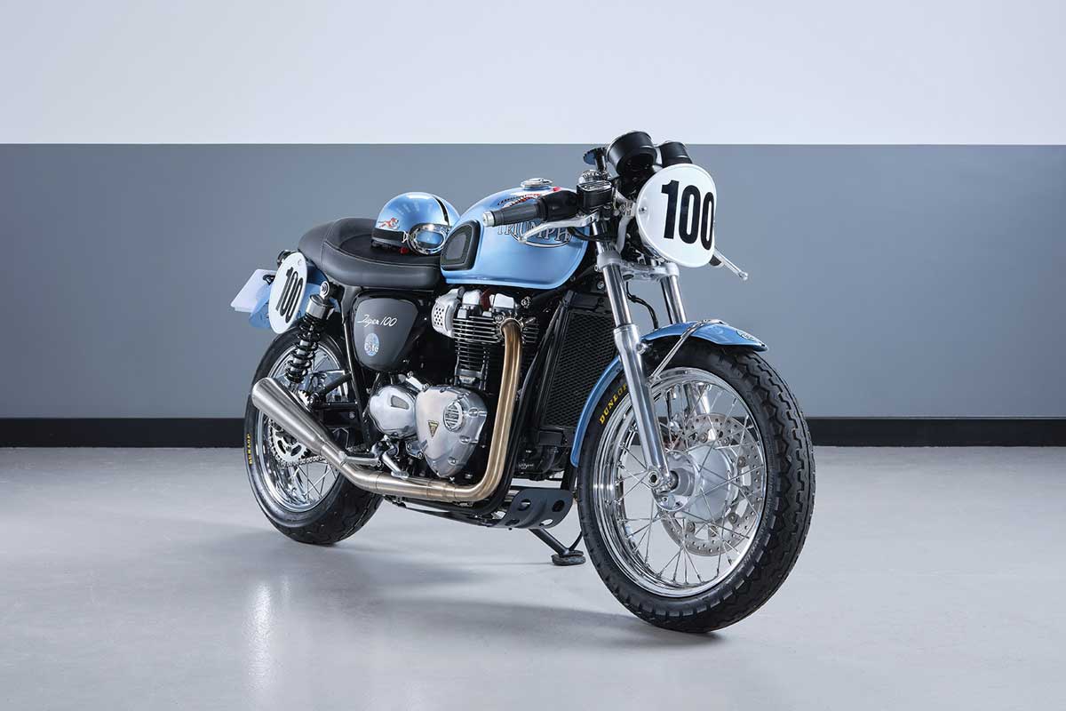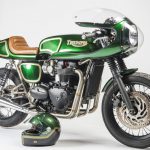 Oxford Triumph has finished the Bonneville using a modern take on the classic Tiger 100 blue. Modern Triumph branding has been dispensed with in favour of handpainted fifties Triumph emblems and the iconic Tiger motif. There’s even a matching pudding bowl style helmet to go with the bike. Racing plates, a faux steering damper, a retro taillight and a set of Dunlop TT100 classic tread tyres complete the look.
