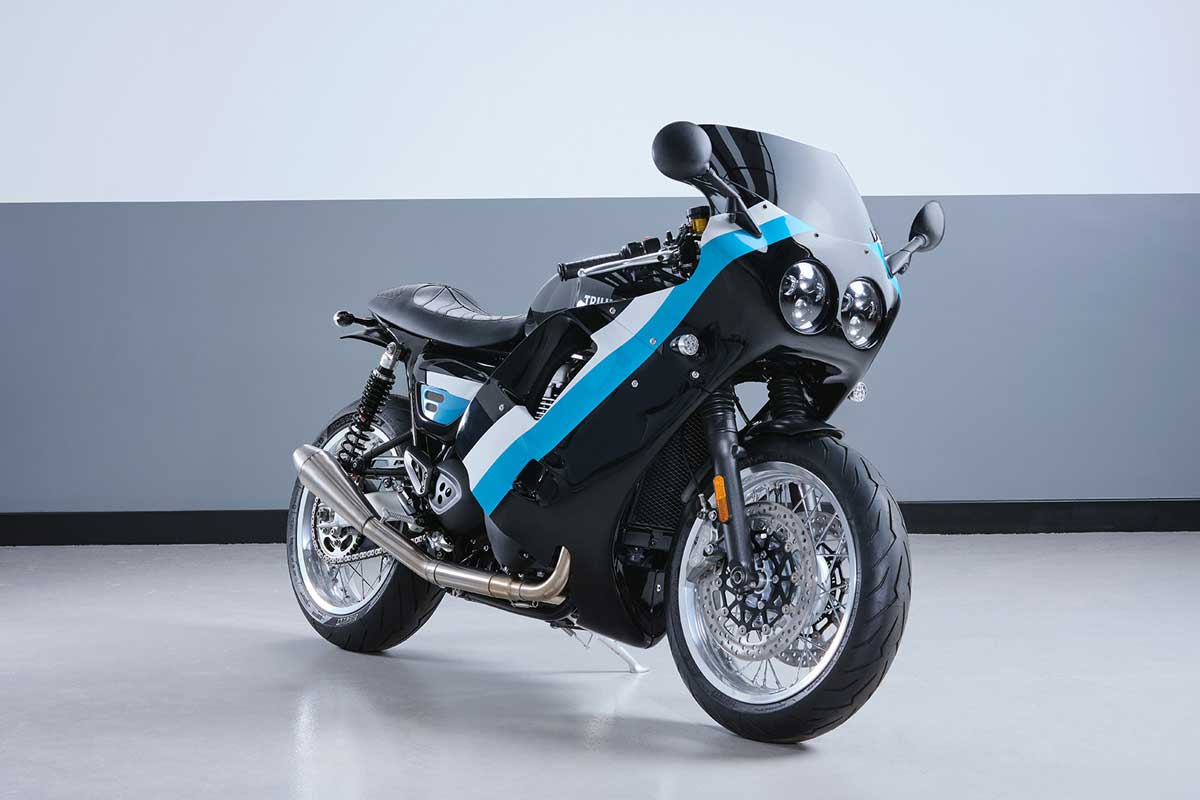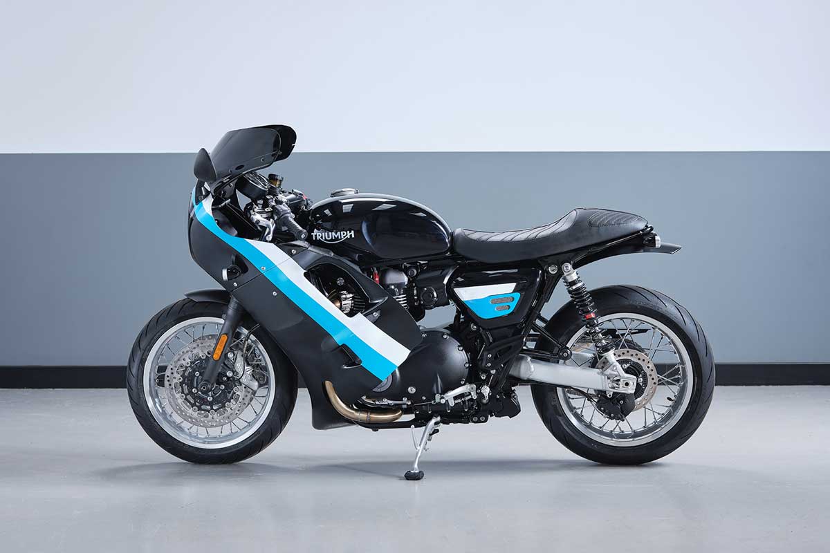 The Speed Racer is based on one of the newest additions to the Bonneville family, the 1200cc Speed Twin. To realise their Bonneville Build-Off concept Edinburgh Triumph stipped the Speed Twin down to the bare minimum before custom mounting the Daytona fairing. A set of machined clip-on bars provide the required amount of steering clearance and the original gauges sit snuggly behind the smoked windscreen. Making way for the bikes 2-into-1 performance exhaust are cut-outs in the lower half of the Daytona fairing. Retro look aftermarket shocks hop up rear end performance and the Speed Twin’s bench seat has been replaced by an elaborately upholstered custom saddle. The icing on this retro cake though is the classic blue, white and black paint scheme which is a hat tip to Hinkley’s Daytona 1200 livery.