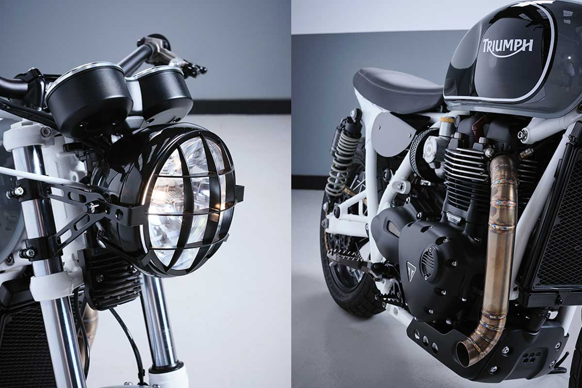 For their Bonneville Build-Off entry, Triumph Oxford created a tribute to the late father of company Dealer Principal, Andy Valentine. Andy’s father Reg was a dedicated Triumph fan and long time cafe racer enthusiast. The aptly named ‘Reggie’s Cafe Racer’ takes styling cues from post-war Triumph 100 production racers. Modifications to the Bonneville T100 donor include a host of Triumph catalogue parts such as a blacked-out sump plate, finned header flanges, drilled chrome chainguard, Triumph barrel grips and a host of engine dress-up parts. The Oxford team have also put their fabrication skills on display with a set of custom made, low slung, clip-on handlebars, a trick 2-into-1 ‘race-style’ exhaust and a cafe racer wasp tail saddle. But on this custom Bonneville build, it’s the visual details that really sing.