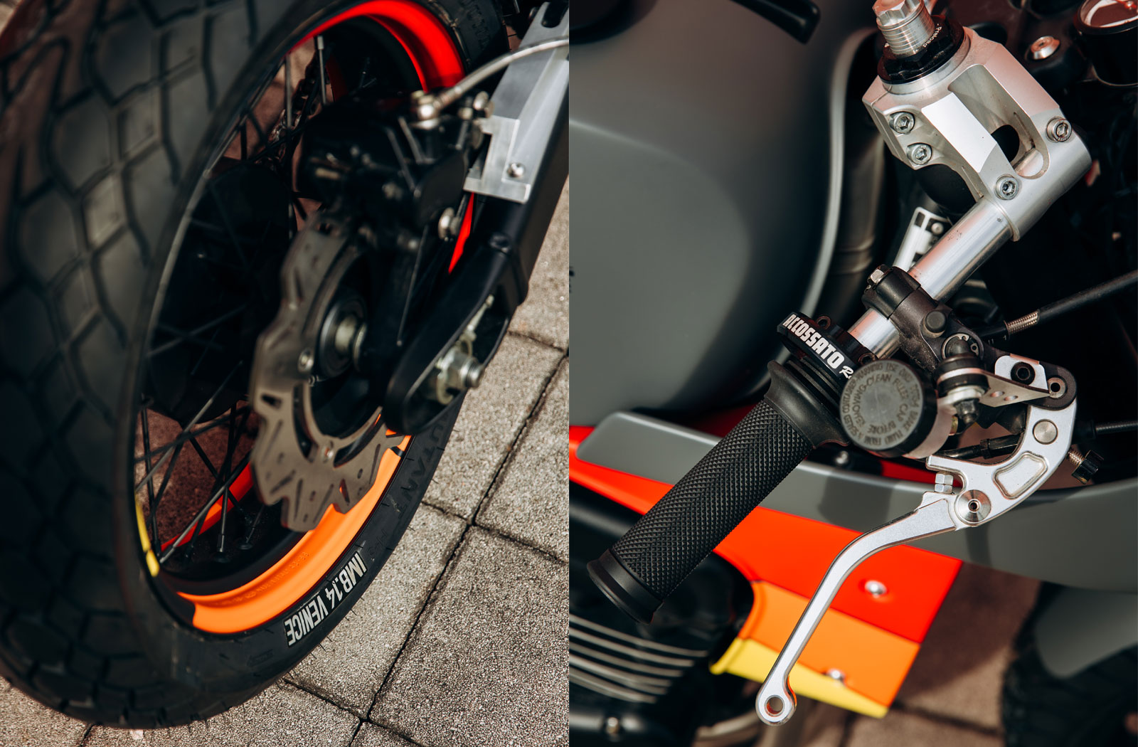 As for the engine it inhales through K&N filters which sit behind gill-like covers. The carbs benefit from a Dynojet stage 1 upgrade and there is a full custom exhaust system by Italian specialists, Virex. As for the result of all this work, Maurizio tells us, “The motorcycle is now well balanced, and precise, and you can use more traction power because of the new suspension.”