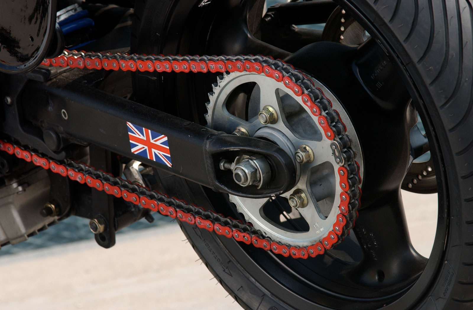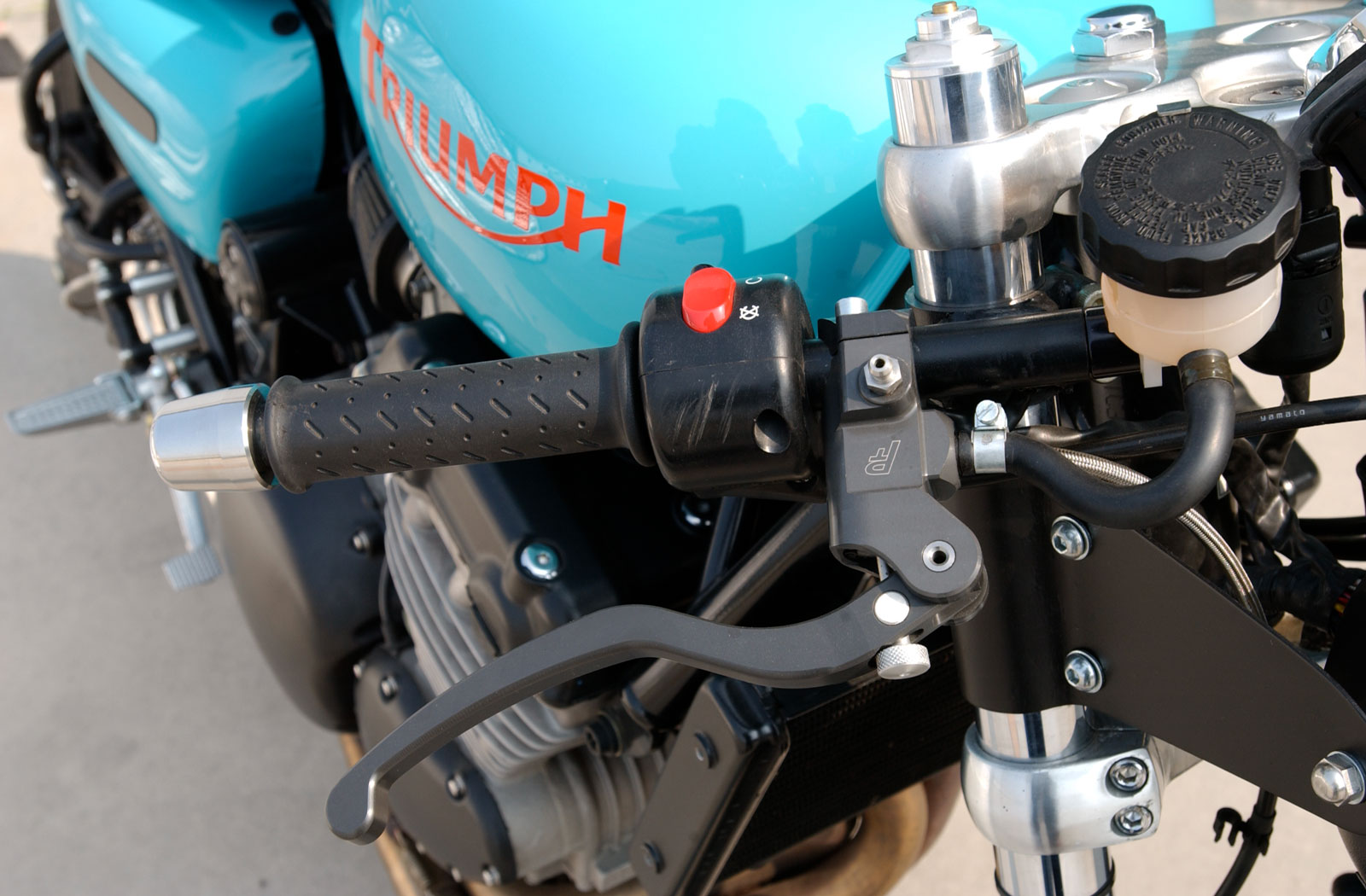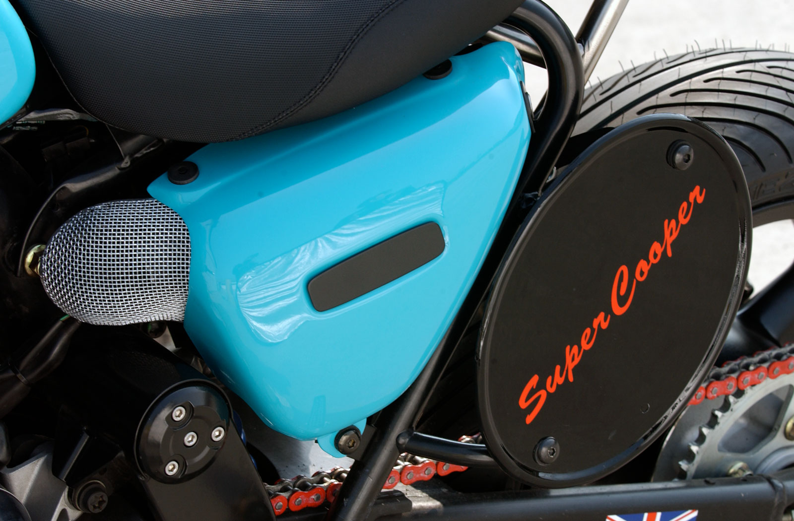 To complete his vision for the bike, Martini continued deleting chrome. As a result, all of the chrome on the transverse triple and chassis were blacked out. For the paint though, Martini went with something unmissable. Super Cooper’s tinware is finished in bright blue paint with contrasting red emblems, and a red chain installed to tie things together. As is customary with cafe racers the cruiser bars have been swapped with Speed Triple clip-ons and the mid-control footpegs with RAASK rear set pegs. Lastly, Martini wanted to add a touch of sports bike style to the cockpit so he ditched the twin clocks and fit a custom-made single gauge.