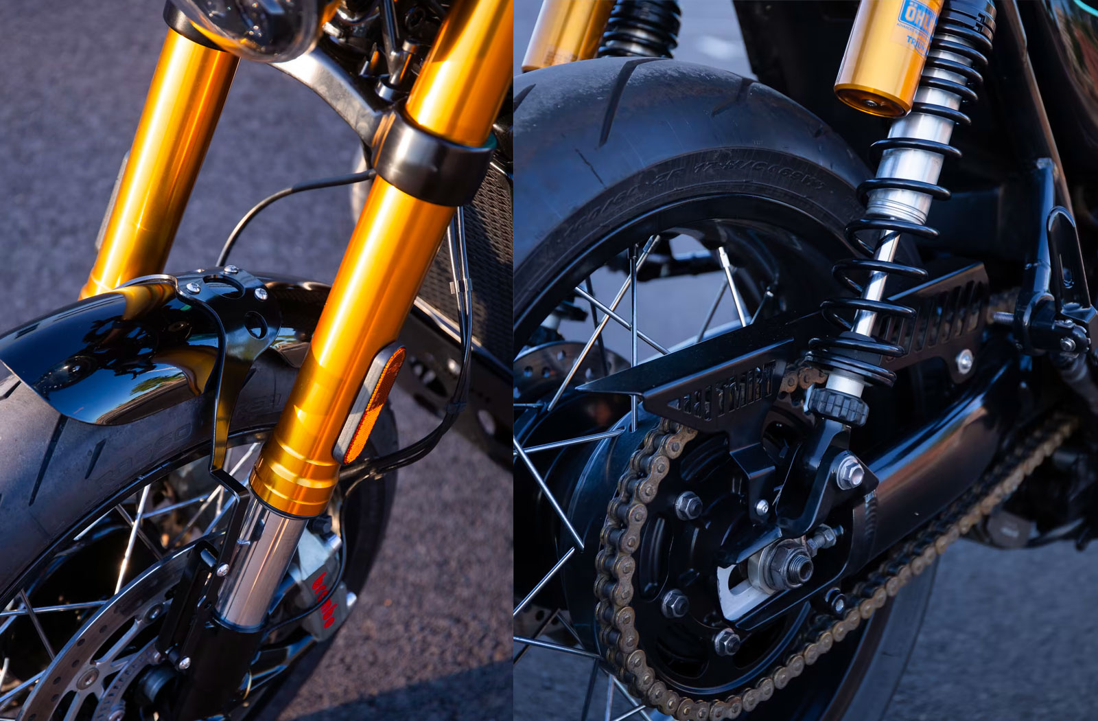 To step things up in the performance department Tamarit has fit this Thruxton R with a tried and tested reverse intake system. Manufactured by fellow Triumph aftermarket specialists Free Spirits, the 180-degree bend inlets aim a set of Power filters into the wind for maximum airflow. To complement the changes to the intake Tamarit has built a one-off exhaust. The striking pie-cut stainless 2-into-2 system is optimized for both aesthetics and performance. The 2 pipes snake around the engine before meeting beneath the stator cover where they most likely breathe fire at one another. To make the most of these changes the fuel mapping has been suitably adjusted.