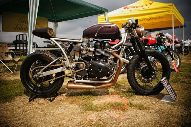 “I purchased a brand new Triumph Thruxton in June of 2008, rode it for a few hundred miles and that November stripped it down and cut it in half. The subframe was made the old school way, no machines, just heat it up, bend it over a jig and voila! Just like that (No, not really just like that). Next up, the rear cowl, I formed some sheet metal until I started to like how the shapes were coming together, just kinda winged it; same goes for the monoshock. Using a Suzuki ’94 RF900 shock Chad and I had some small trial and error runs getting it right but now it works and handles ten fold. The gas tank which is off a Honda CB200 was just kinda lying around the shop. I gave it to my wife for her bike but took it back again because it just seemed to work better on the Triumph, like the headlight which came off of another project bike in the garage.