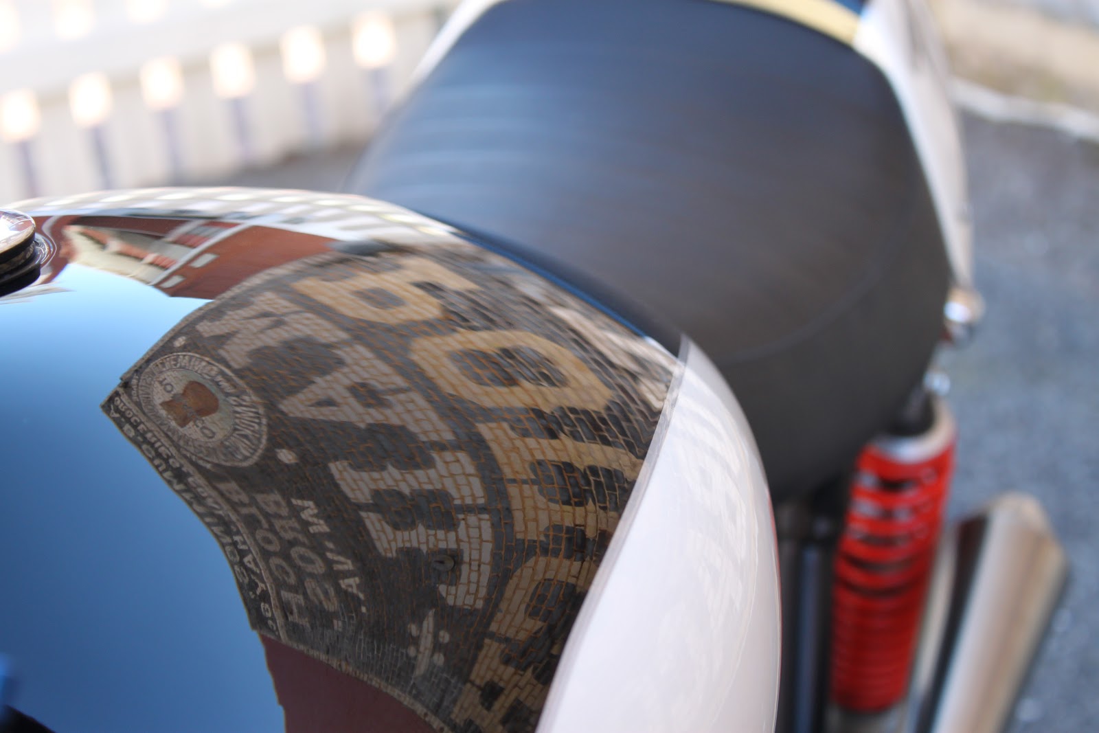 The frame received minor modifications mainly to get rid of the tabs that used to secure the air box, electrics and stock exhausts. The fame and bodywork was custom painted by George Tortarella in NY complete with pin striping and lucky 13 numbering.