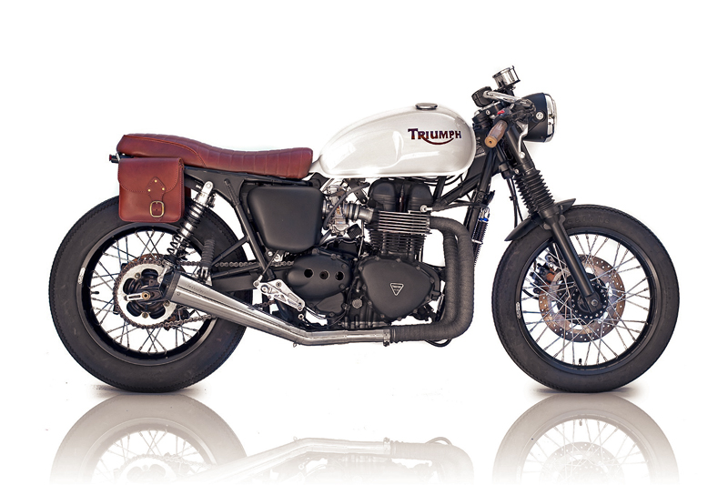 Here’s the latest custom motorcycle build from the new Deus ex Machina in Venice, USA. The modern Triumph Bonneville has been tastefully upgraded with a new paint scheme, custom trimmed tan leather seat and mini paniers with matching gummy gips, a smaller headlight and instrument cluster and ace style bars. Performance has also been made more interesting with the addition of a set of CR carbs and a custom 2-into-1 exhaust system.