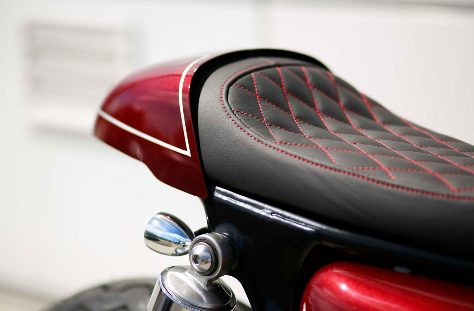 When the time came to choose a colour Grzegorz pitched a rather bold scheme to the bike’s owner. “I love the fact that was he brave enough to paint his machine this dark Bordeaux metallic red,” he says. “We invented it with our painter. In the shade, it’s really dark but in the sun it shimmers with bright sparkles.”