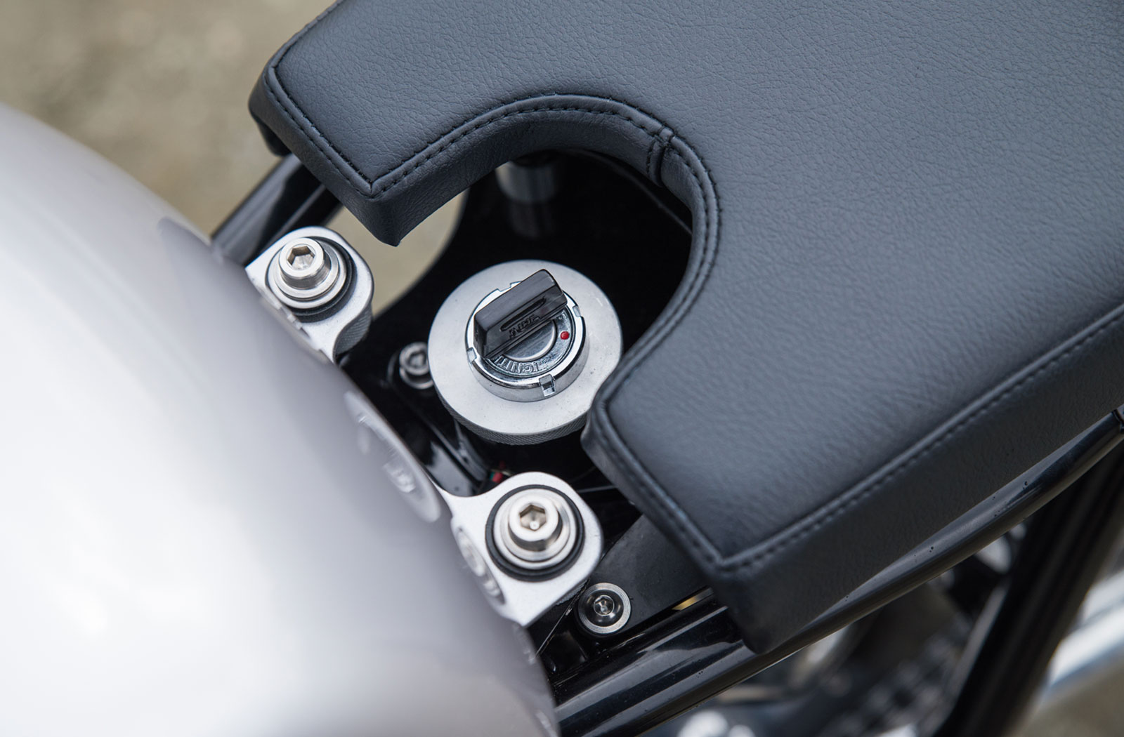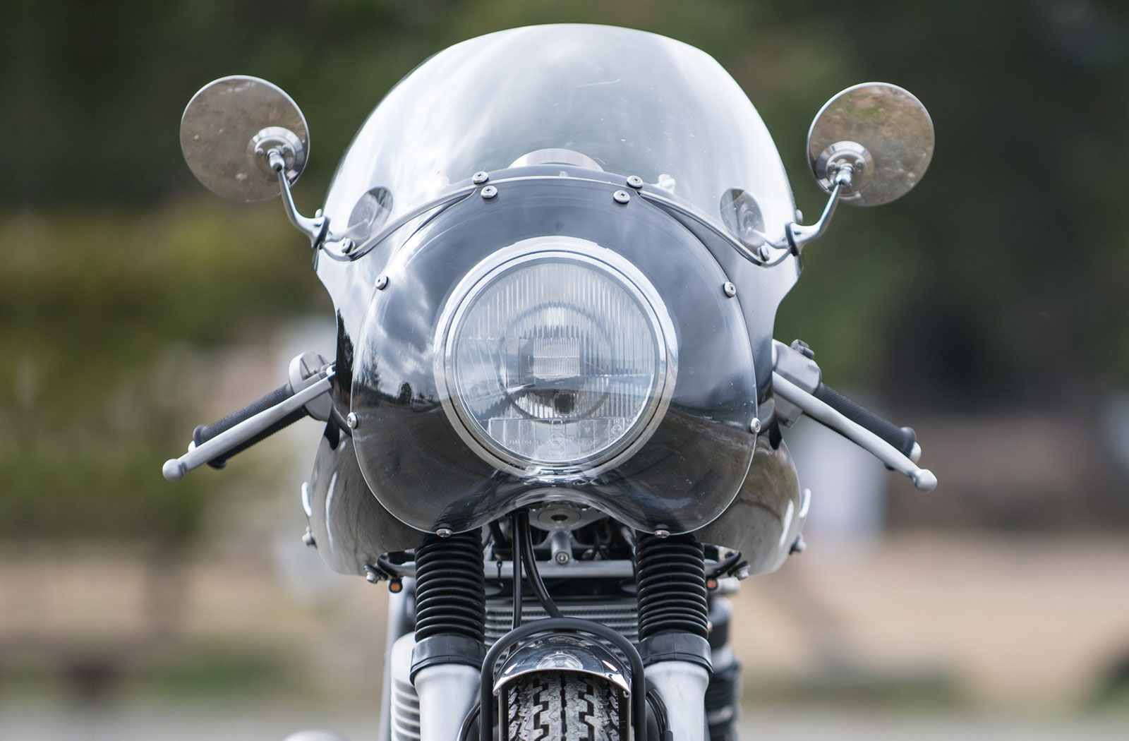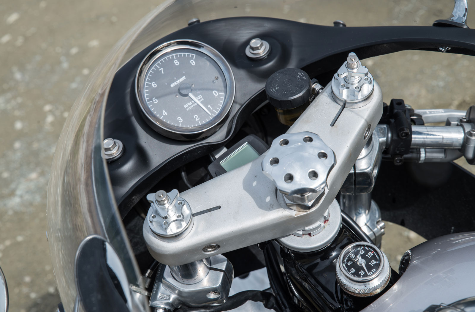 Kicking off the list of changes is an Avon-style front cowl. Sporting a clear perspex bubble over a classic round headlamp it screams of 1950s British race bikes. Mounted into the dash is a single Pivot tachometer for keeping a close eye on the engine’s revs. To accommodate the fairing the stock bars have been replaced using Magura clip-ons and they are mounted to the original forks.