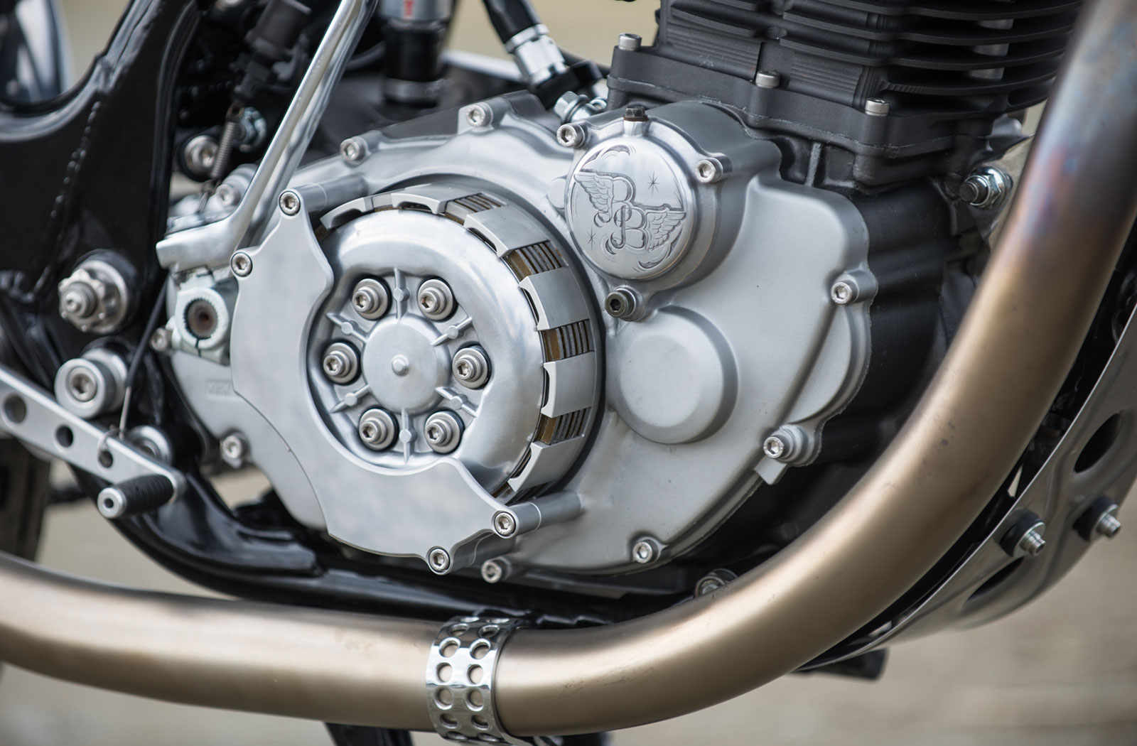 Once a mild-mannered small capacity 400cc single, the engine of this bike is now a mid-sized 600cc monster. The huge increase in capacity comes courtesy of a Tressel billet cylinder with large cooling fins and a performance piston. Inside the motor, there’s also a Yoshimura cam and an Araki F Machine dry clutch kit. To feed the thirsty engine an FCR 41mm flat slide carb hangs off the intake while the beast exhales through a hand-bent stainless steel header and titanium megaphone silencer. Keeping operating temperatures in check is a front-mounted oil cooler and power is delivered to the rear end by an Enuma chain.