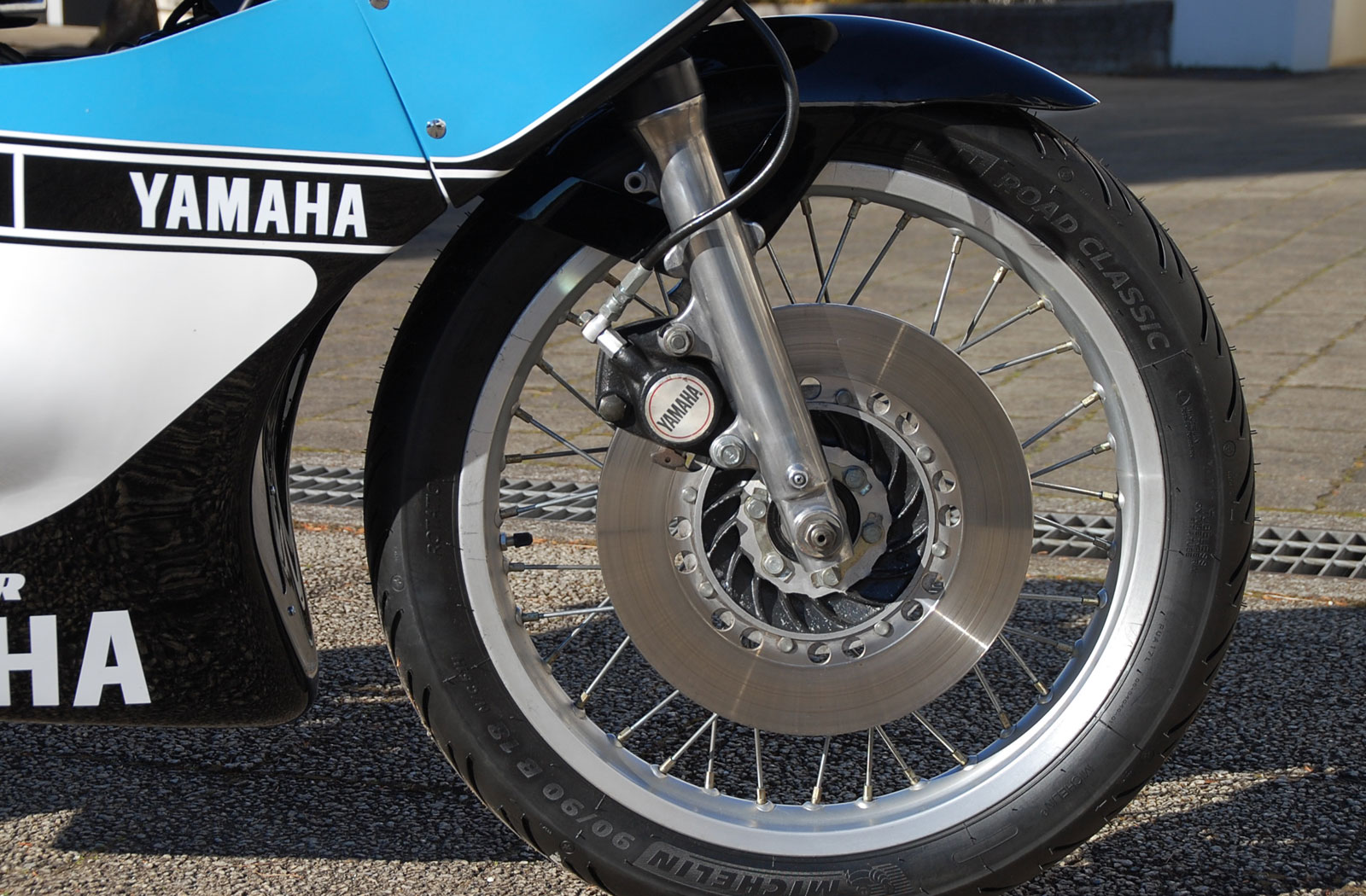 The most unique aspect of this restored TZ 250J is the colour scheme which Yutaka-san designed himself. The speed block pattern and graphics layout were inspired directly by the motorcycles ridden by Yamaha race team legend, “King” Kenny Roberts.
