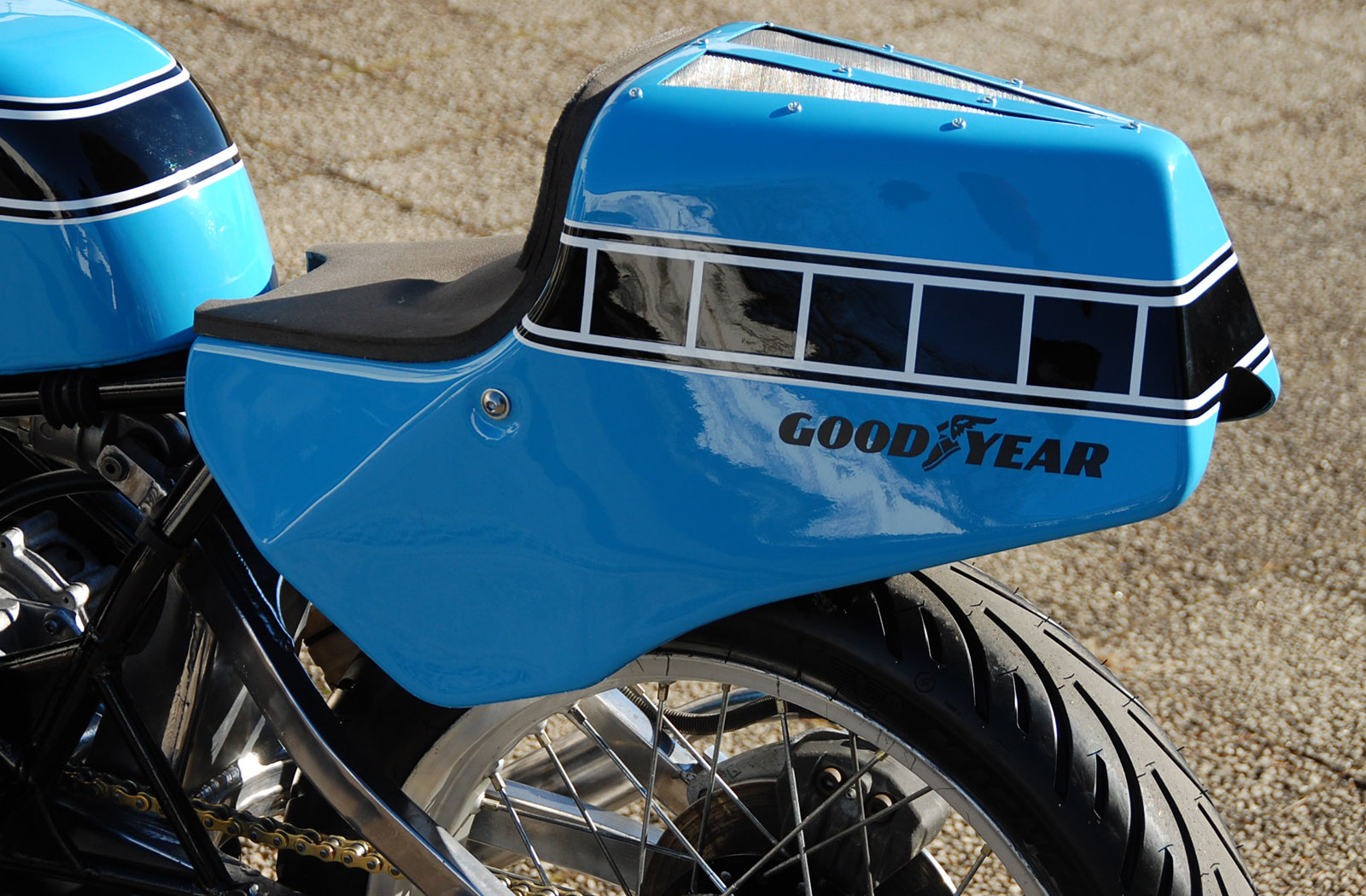 The motorcycle that inspired Yutaka-san’s design was King Kenny’s Championship winning 1980 Yamaha OW48. The 2 bikes schemes are almost identical with the exception of the number 2 race number as opposed to Kenny’s 1. Yutaka-san has also opted to put his own nickname, Hossy, on the sides of the windscreen and went with a blue Yamaha scheme as opposed to the yellow of Roberts’ race bike. The final paintwork was laid by Wedge motorcycles while the race numbers and Hossy lettering are the work of Japanese pinstripe artist Shakin’ Speedgraphix.