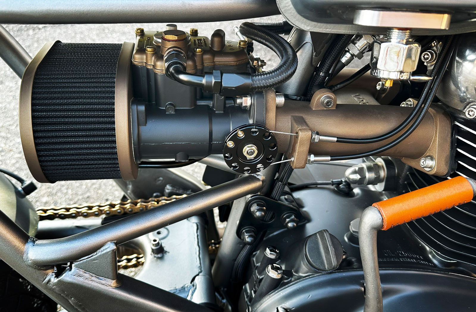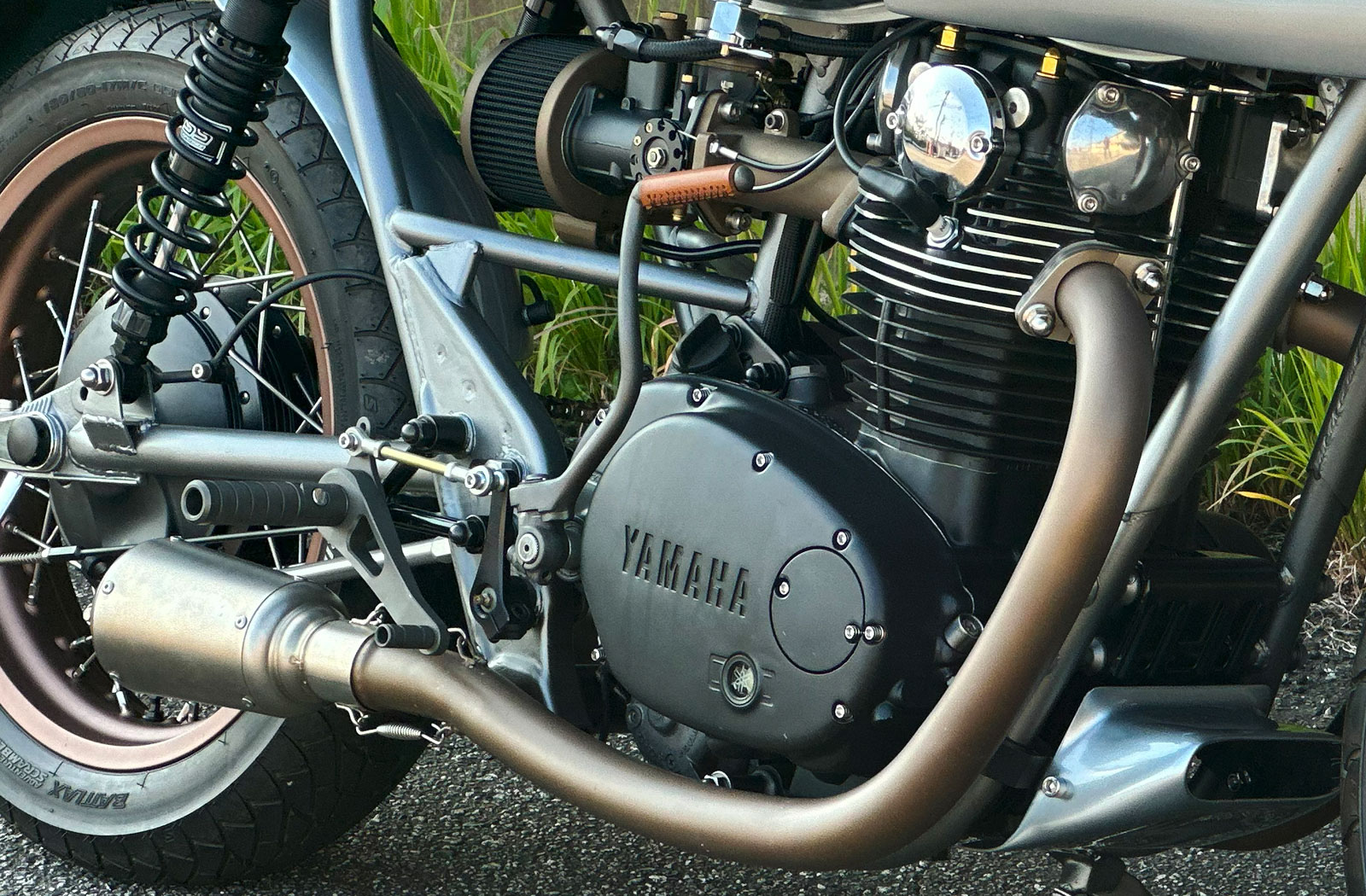 At the heart of Masaaki’s TX650 Mustang lies a re-engineered parallel twin. Masaaki bored the original 654cc cylinders out to 750cc and fitted them with new pistons for a boost in power that’ll ensure the bike can hold its own in 21st-century traffic. Fueling is managed by a rather unexpected addition from Weber’s range of carburetors. Masaaki fitted the DCOE40, which is designed for smaller car engines, using a custom-designed and 3D-printed nylon intake manifold of his own design. A 2-into-2 custom exhaust system completes the setup and provides a note more befitting of a motorcycle with fighter plane styling.