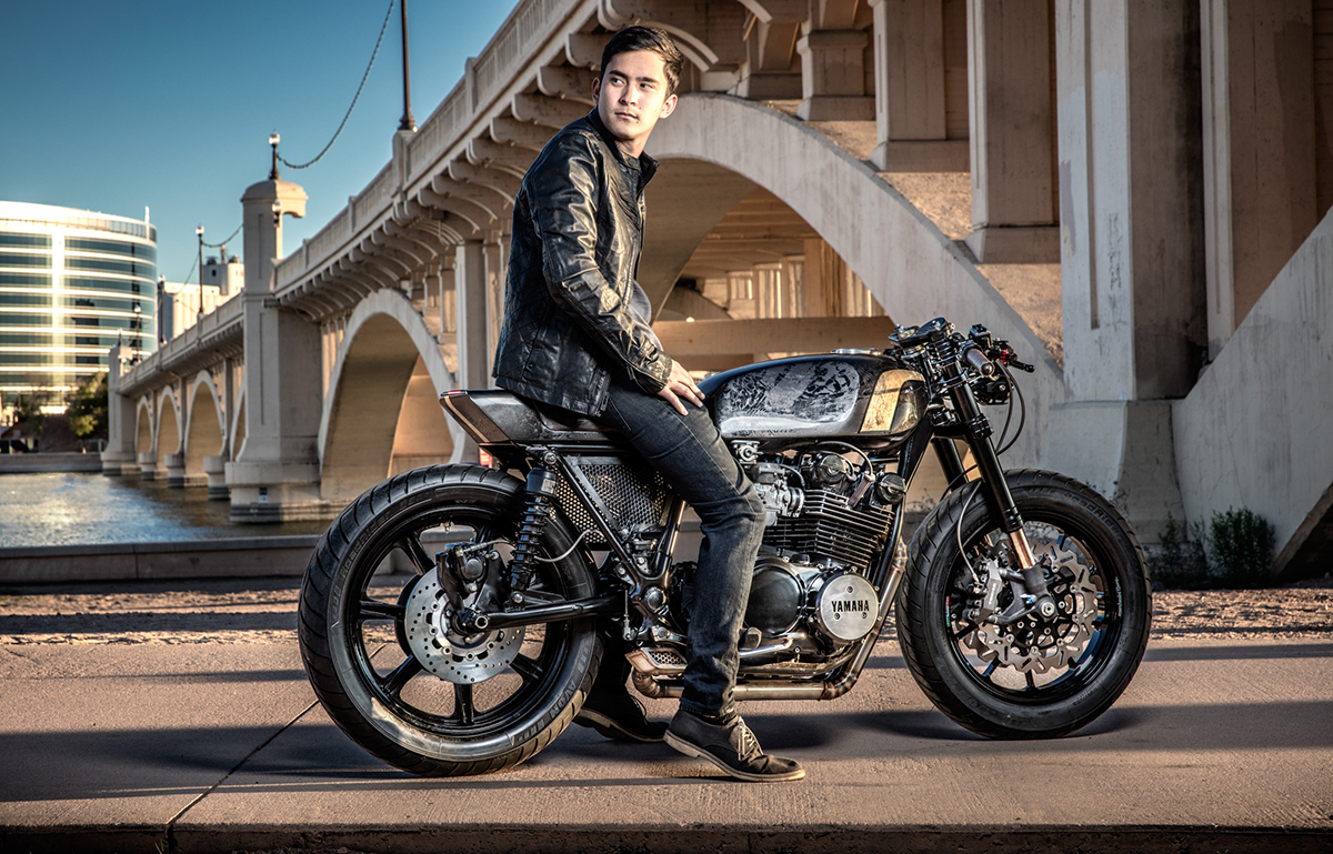Inspiration for the paint scheme comes from Yamaha’s racing colours of the 1960’s, made famous by Kenny Roberts when he took out the World Championship in 1968. To finish off the styling a cheeky SR Turbo graphic has been hand laid in variegated gold leaf on the side covers, to let those who are gazing at the right side of the bike know that there’s something special about this bike lurking just out of view.