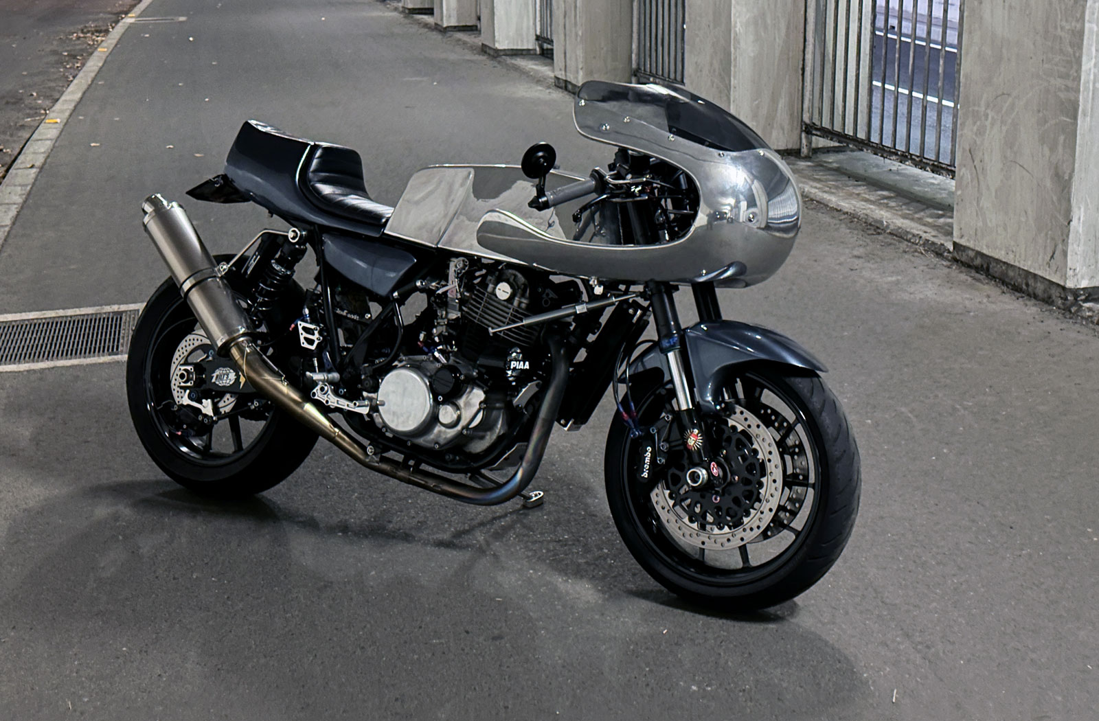To improve the handling, he’s integrated sportbike components such as the cannibalized and modified front fork and triple tree assembly from a late model Kawasaki ZXR400. The same donor provided a pair of Brembo 65mm 4-pot double calliper front brakes to which Youziro has added modern Sunstar 310mm premium racing discs. The rear end of the SR features the cannibalized and modified swing arm from a Yamaha FZR400R SP. It’s supported by modern Aragosta piggyback twin shocks. In addition, both the front and rear wheels have been upgraded using Gale Speed Type-R rims and Dunlop GPR300 rubber. These upgrades ensure this Yamaha cafe racer not only looks the part but also delivers a thrilling ride.